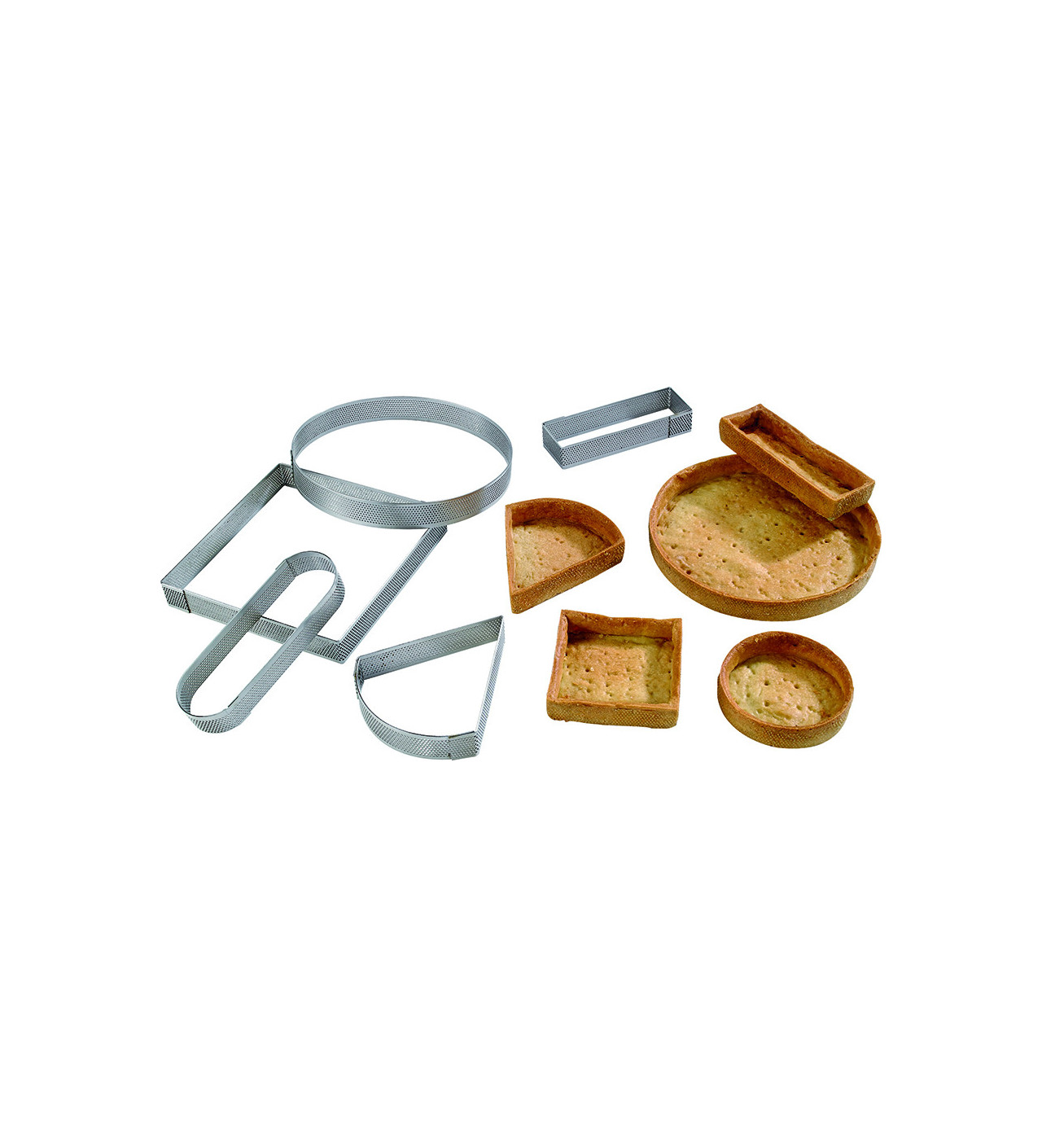 Las micro perforaciones permiten que la humedad se evapore durante la cocción y dan un bonito color a la masa. No es necesario engrasar o utilizar un papel sulfurizado para retirar el aro para tartas perforado, simplemente levántalo con cuidado.
