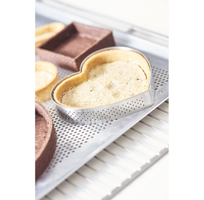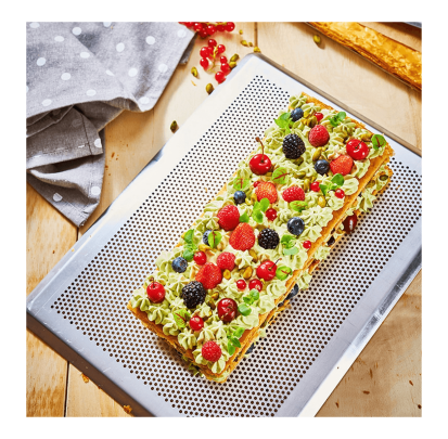 La bandeja microperforada se utiliza principalmente junto con un tapete de silicona o con un molde de silicona. En efecto, la bandeja horno perforada le dará estabilidad a tu pastel y las perforaciones garantizarán una circulación del aire perfecta bajo el molde para obtener un horneado uniforme de tu preparación. También puedes recubrir de papel de horno la bandeja perforada.