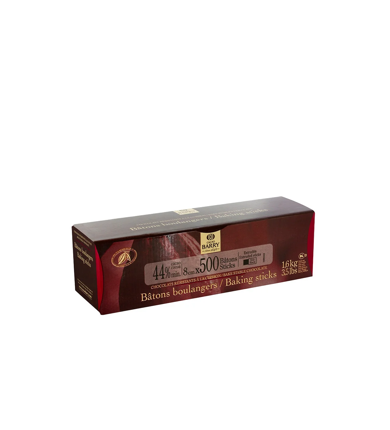 Estas barritas de chocolate para bollería de la marca Barry contienen un porcentaje mínimo de 44 % de cacao y cada una mide 8 cm de largo. Soportan altas temperaturas en el horno y poseen un sabor intenso, por lo que dan un toque especial para postres de bollería.