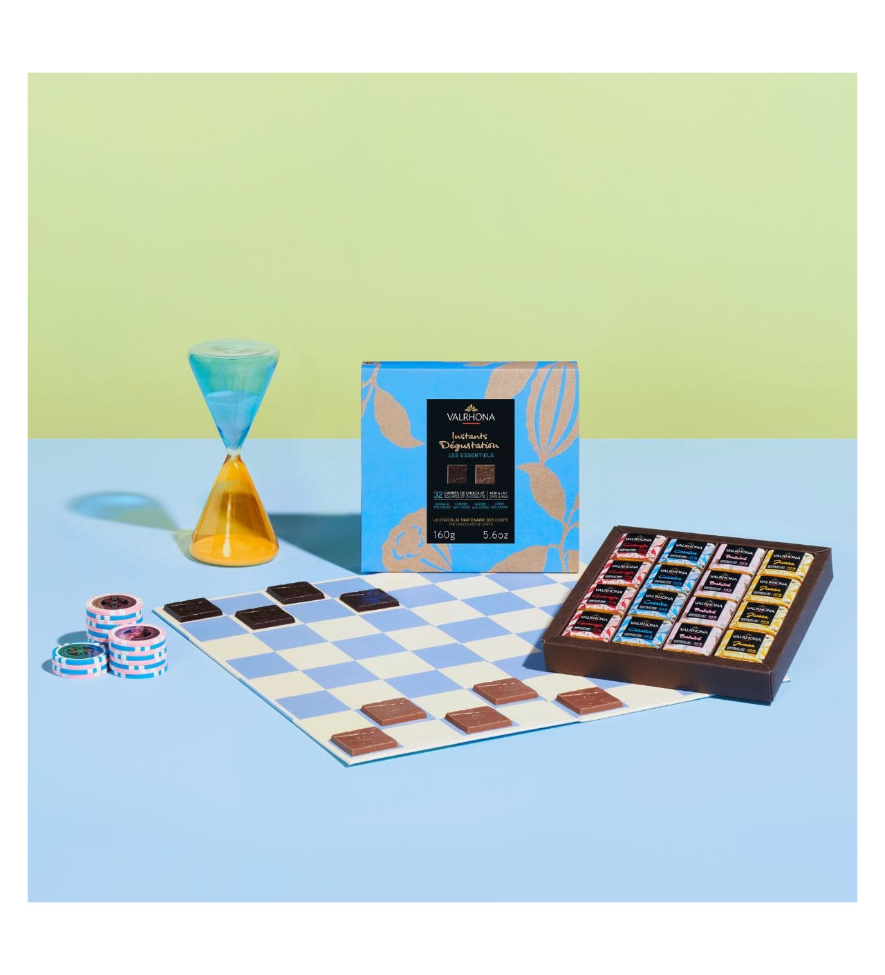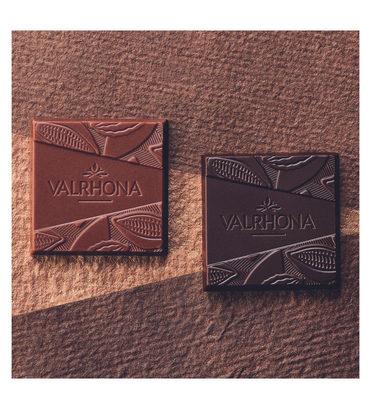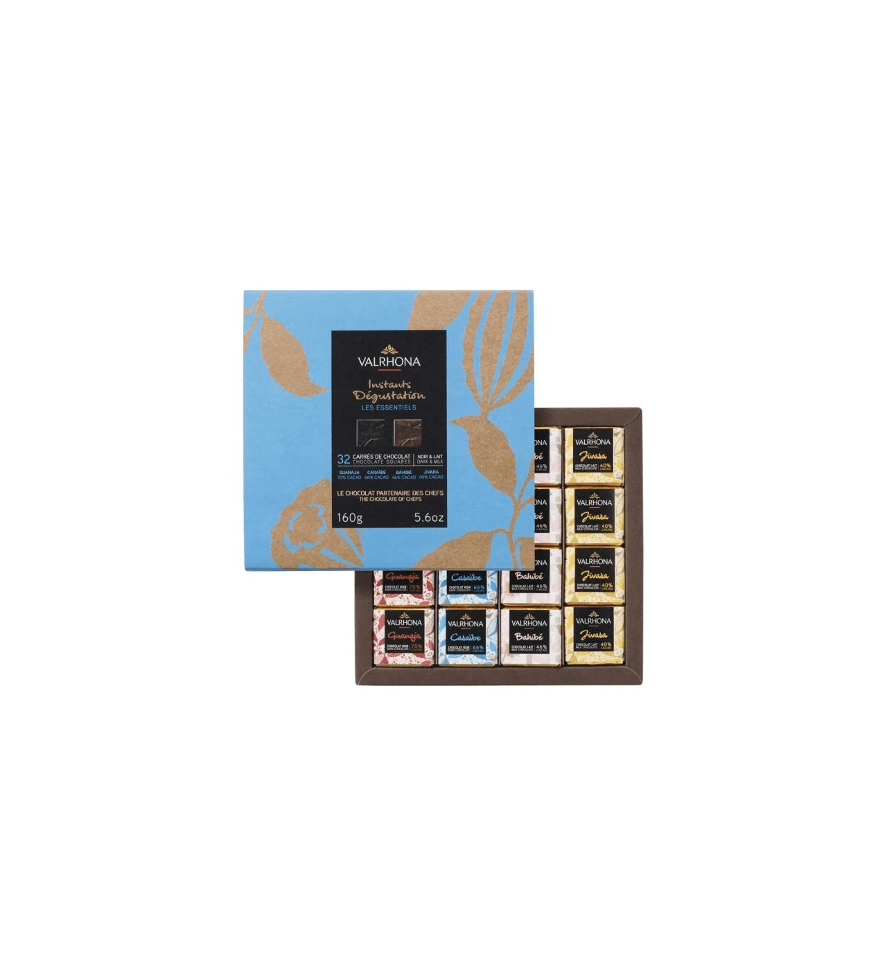 ¡Deléitate con los sabores de los chocolates Valrhona! Prueba toda la caja de 32 cuadritos Valrhona de chocolate con leche y chocolate negro de la gama "Les Essentiels".