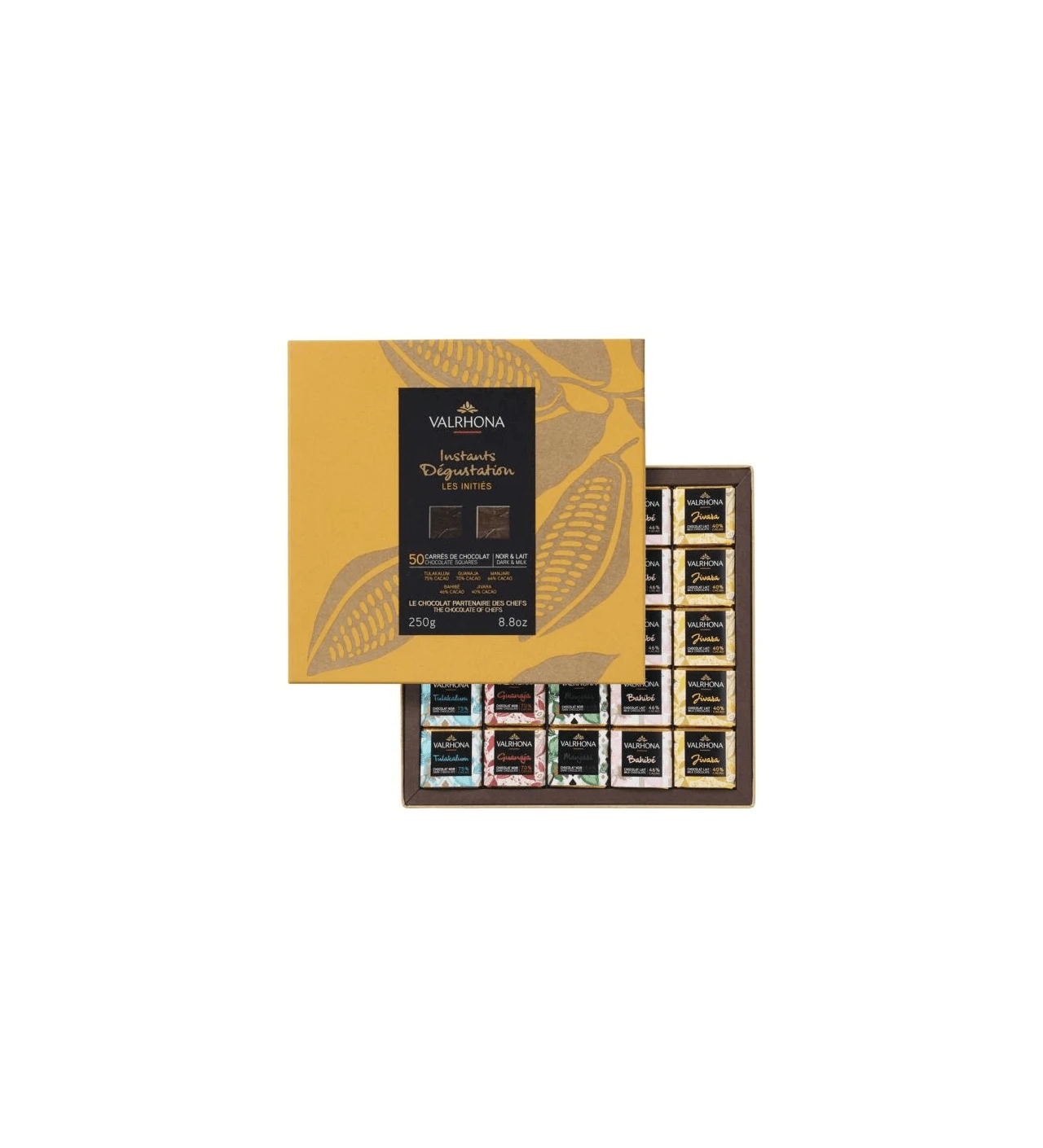 Características de la Caja de 50 Cuadros de Chocolate Negro y Chocolate con leche Les Initiés 250 g Valrhona: