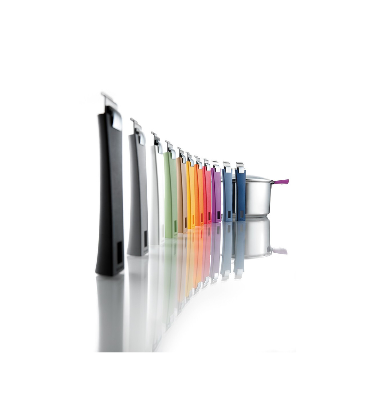 Las colecciones «mango extraíble» de Cristel ofrecen asas y mangos diseñados con precisión, estos permanecen sujetos a los utensilios sin riesgo a caerse. Además, los mangos y asas desmontables de la colección Mutine Mango extraíble son compatibles con todas las colecciones extraíbles de Cristel.