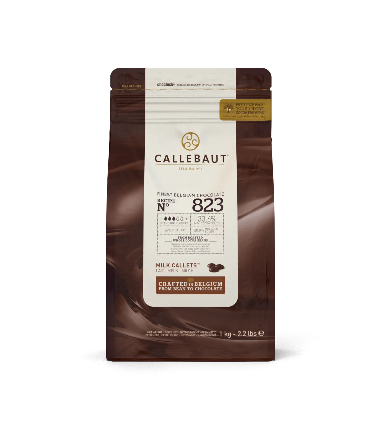 El chocolate con leche Callebaut viene en forma de callets, pequeñas pastillas que facilitan la dosificación y el derretimiento del chocolate.