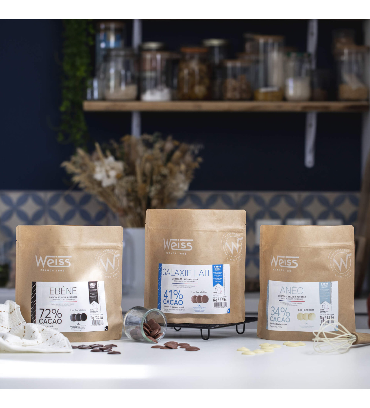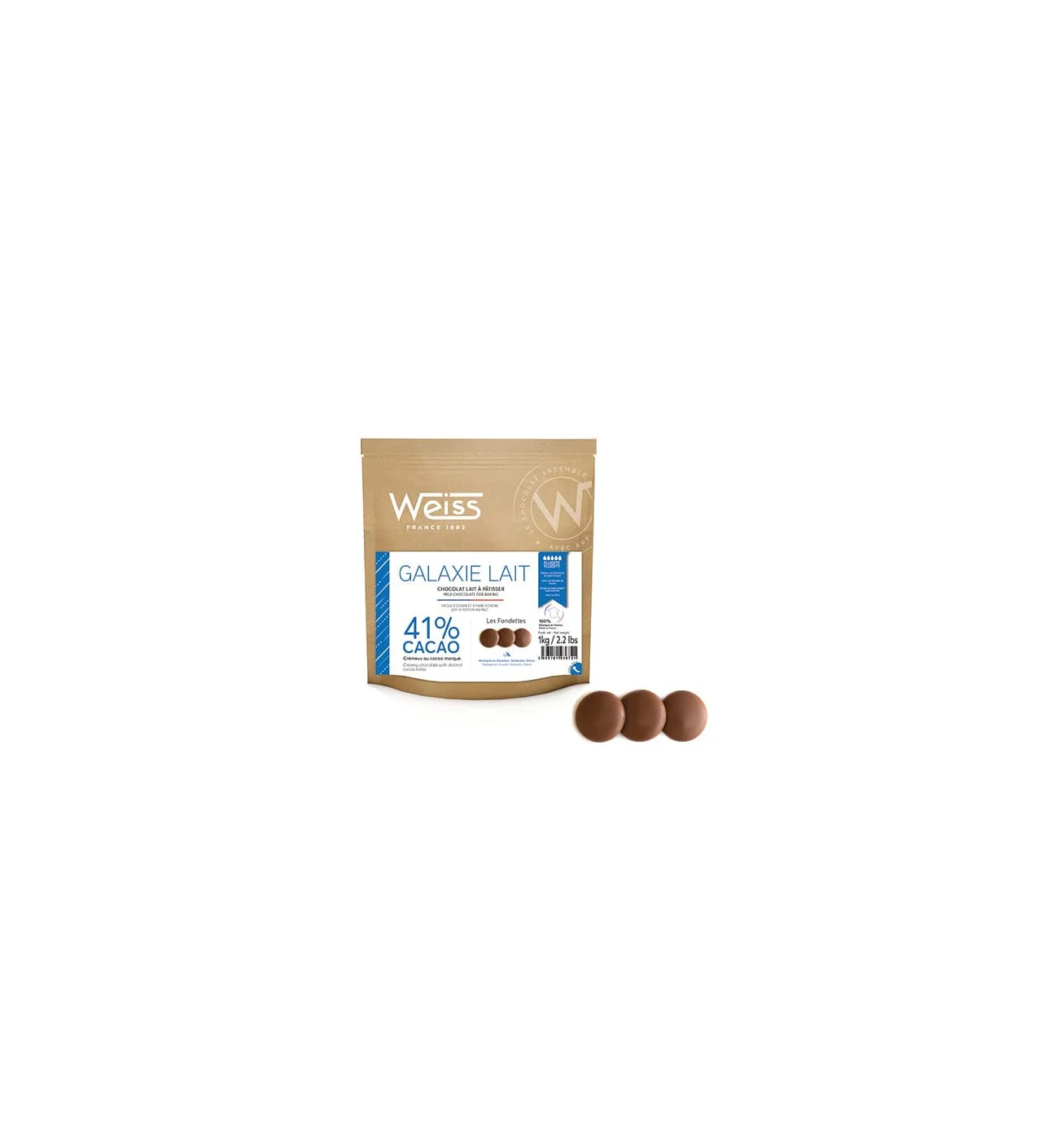 El chocolate Galaxie de Weiss viene en fondettes de chocolate, pequeños discos de unos 2 g que se derriten fácilmente y garantizan dosis exactas. Para cumplir con todas tus expectativas, esta bolsa en papel kraft trae 1 kg de chocolate con leche 41%, ideal para tus recetas preferidas.