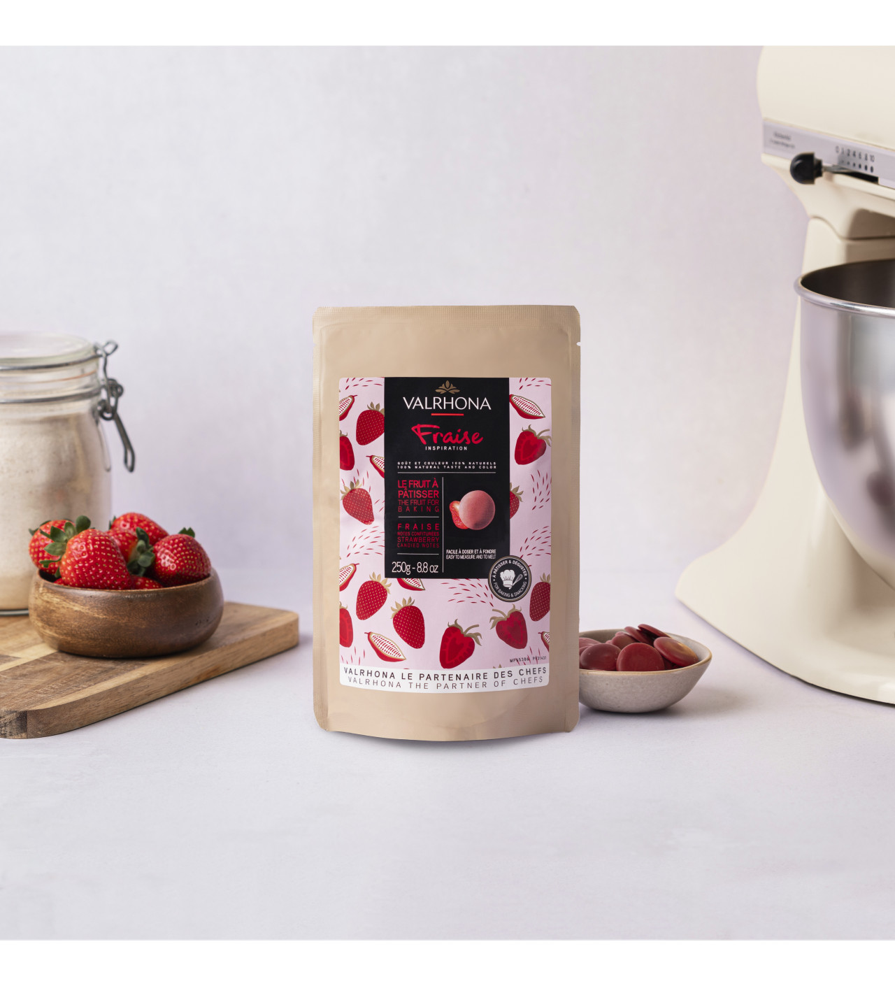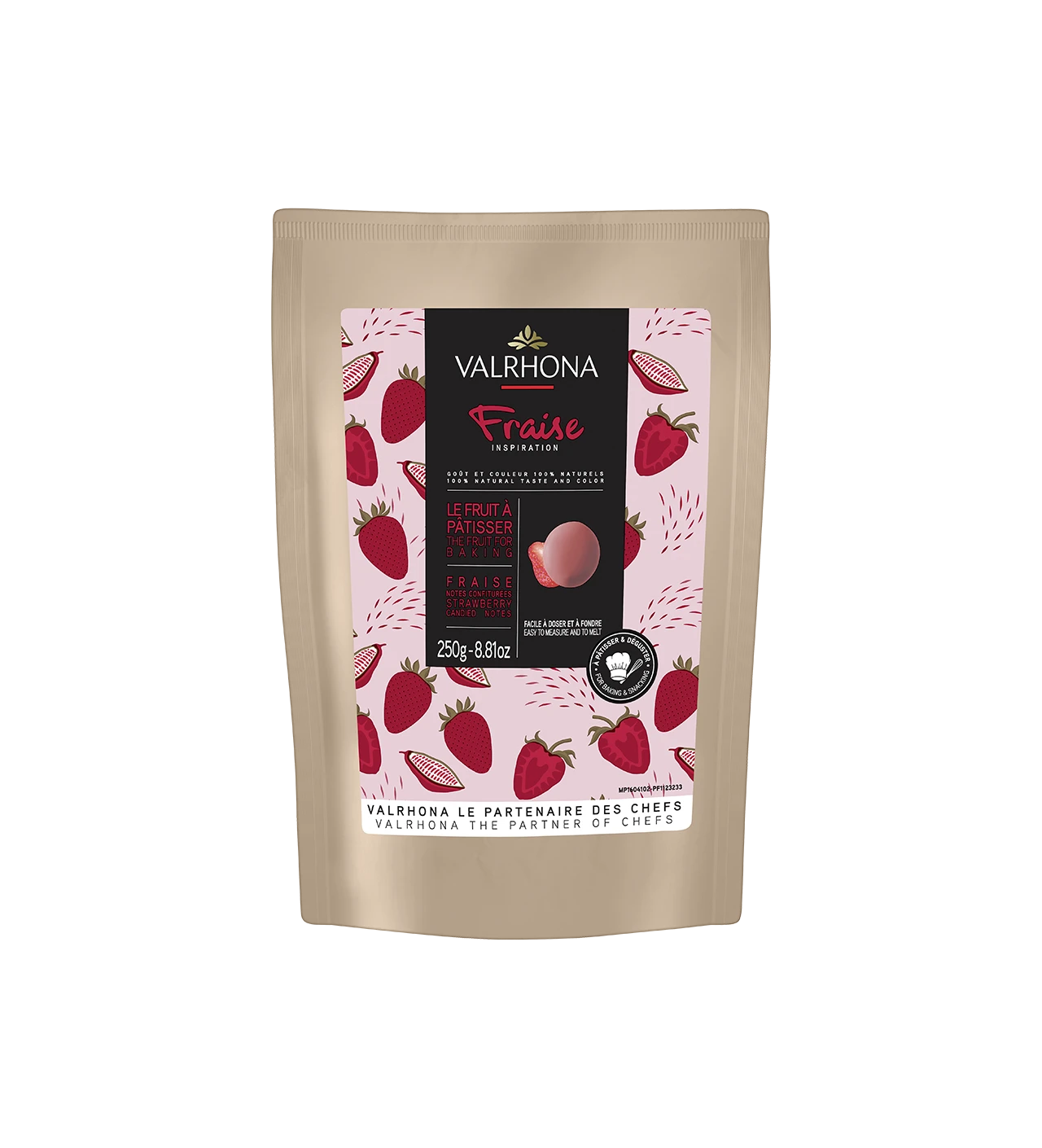 ¿Te gusta cocinar con chocolate? ¿Te encantan las fresas? ¡Entonces estás en el lugar indicado! Descubre la innovadora creación de Valrhona: una fruta natural que se utiliza fácilmente en la cocina como si fuese chocolate. Te invitamos a dar rienda suelta a tu creatividad con esta cobertura de chocolate en forma de discos de chocolate de color y sabor 100% natural, elaborada a base de una amalgama única de fresas, manteca de cacao y azúcar.