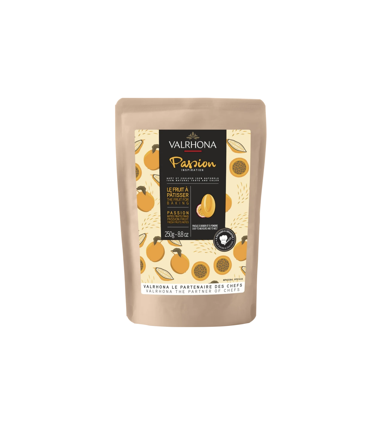Descubre la frescura ligeramente ácida con notas tropicales de Valrhona en un formato único. Desde 2016, Valrhona hace una verdadera hazaña técnica en la que nos permite transformar la fruta de la pasión en preparaciones pasteleras de manera simple y sencilla como si fuese chocolate. Esta cobertura de chocolate de fruta de la pasión con olor y sabor 100 % natural viene en forma de habas, por lo que es perfecta para usar la dosis necesaria y se funde con gran facilidad. Una gran innovación que expande los horizontes culinarios de nuestra creatividad.