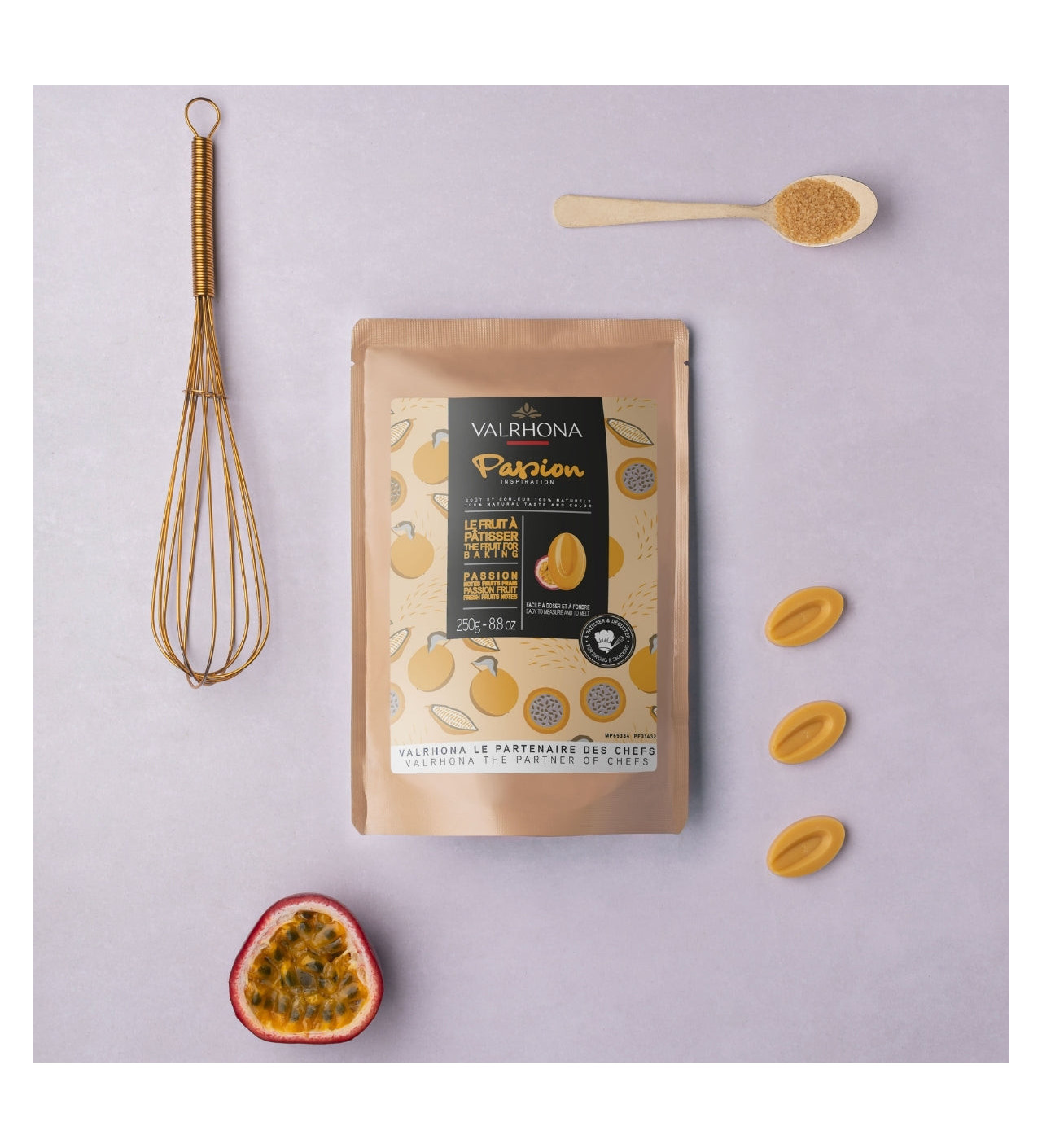 Con este chocolate de cobertura frutal, Valrhona seduce a los amantes del chocolate y también a reconocidos chefs como el pastelero Eric Verbauwhede de Valence-sur-Rhône (Francia), quien asegura disfrutar su sabor intenso y experimentar con las diferentes texturas posibles hechas con el chocolate Inspiration de fruta de la pasión.