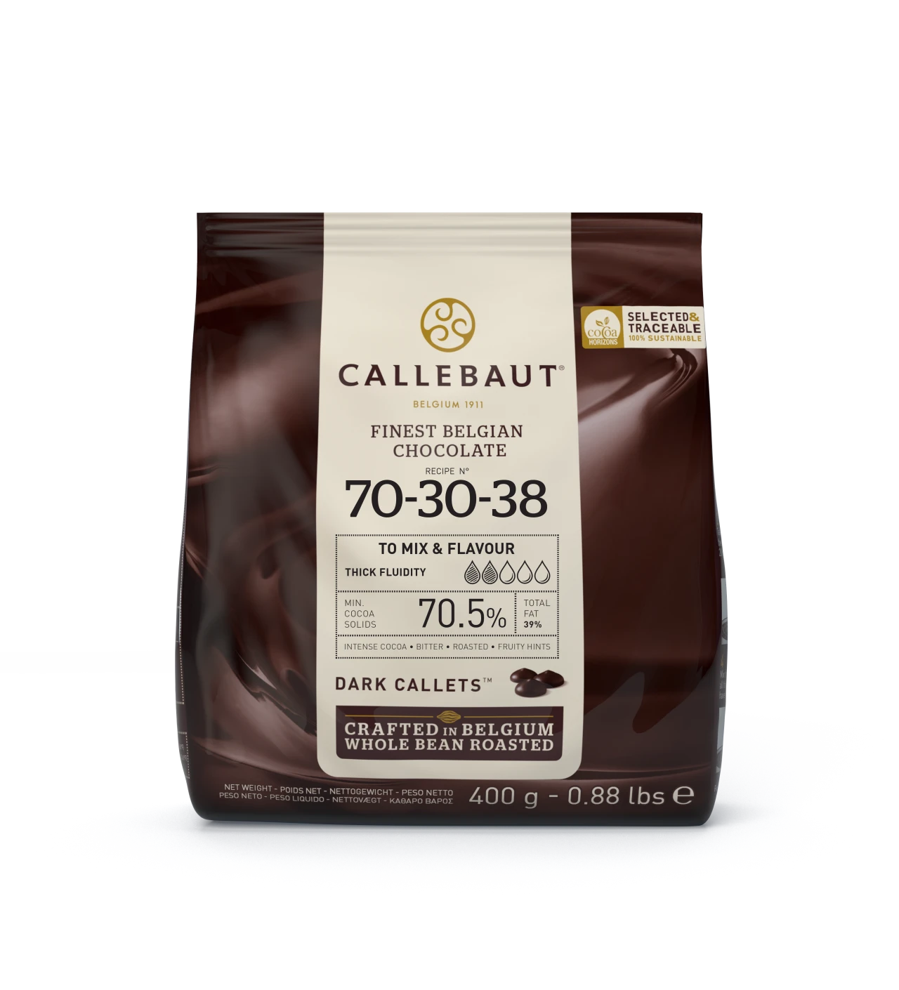 Elaborado a partir de una mezcla de cacao de tres países distintos (Costa de Marfil, Ghana y Ecuador), el chocolate negro Callebaut 70-30-38 ofrece un sabor 100% equilibrado con notas intensas y afrutadas. Este chocolate de cobertura negro es uno de los preferidos de los chocolateros de todo el mundo. Esta elección se debe a su sabor intenso a cacao que permanece equilibrado. El chocolate de cobertura para tartas Callebaut es ideal para añadir un delicioso sabor a cacao a tus recetas.