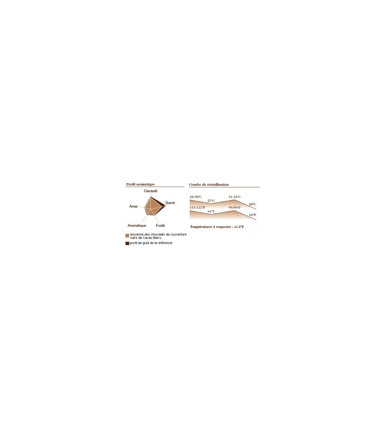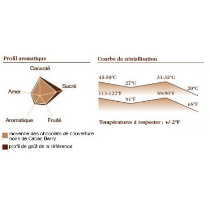 Este chocolate de cobertura de un negro intenso combina perfectamente con: caramelo, café Arábica de Java, flor de sal, cereza negra, frambuesa, pera, plátano, albaricoque, ron añejo, Côtes du Rhône, pan.