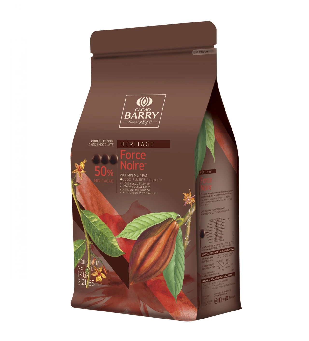 Paquete de pistoles 5 kg: paquete de chocolate en pistoles Force Noire 50% Barry 5 kg con cierre hermético para una protección óptima del sabor.