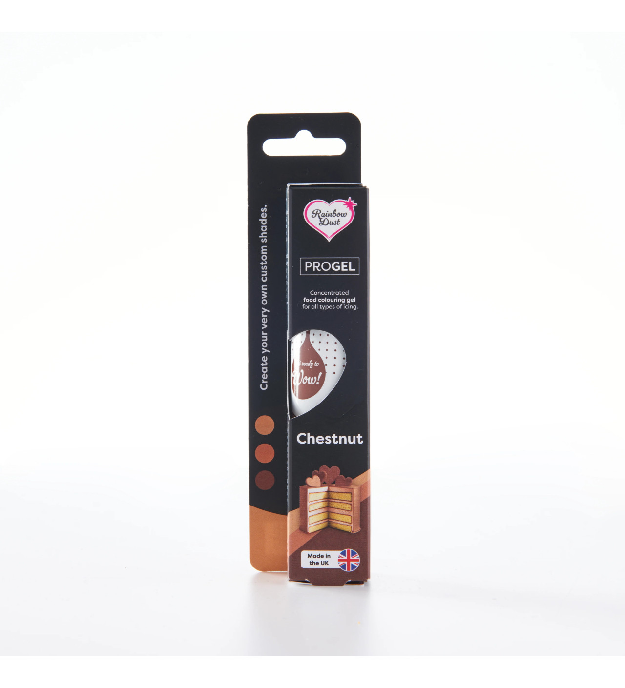 La marca profesional Rainbow Dust ha desarrollado un colorante alimentario en gel de intenso color Castaño (chestnut) con reflejos de avellana que será ideal para realzar tus cremas, ganaches, glaseados, pastas de azúcar, mazapanes, fondants, pasteles, galletas y macarons. Fácil de diluir, este colorante alimenticio en gel permite obtener un color perfecto que permanecerá intacto incluso después de hornear.