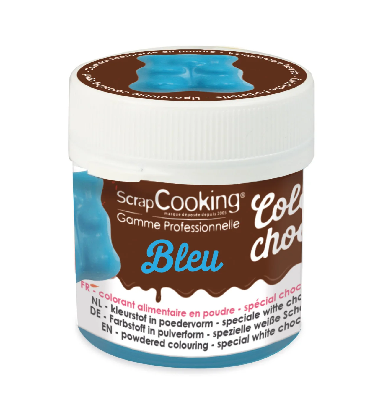 Una vez abierto, el colorante liposoluble para chocolate debe conservarse en un lugar sin exposición a la luz y sin humedad para mantener todo su esplendor. Este colorante para chocolate viene en un frasco con tapa de 5g y tiene el potencial necesario para sorprender a todos los amantes del dulce, niños o adultos, con su tono azul. También puedes encontrar este colorante alimentario para chocolate de Scrapcooking en diferentes colores: rojo, amarillo, naranja y verde.