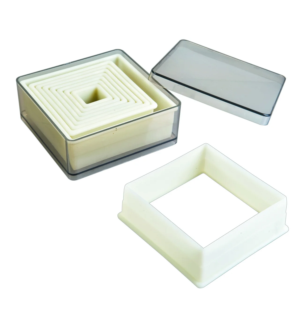 Esta caja con nueve cortadores de galletas con bordes lisos cuadrados en Polyglass te garantiza un corte impecable y preciso sobre tu masa. La manipulación es fácil gracias a sus bordes gruesos y redondeados.