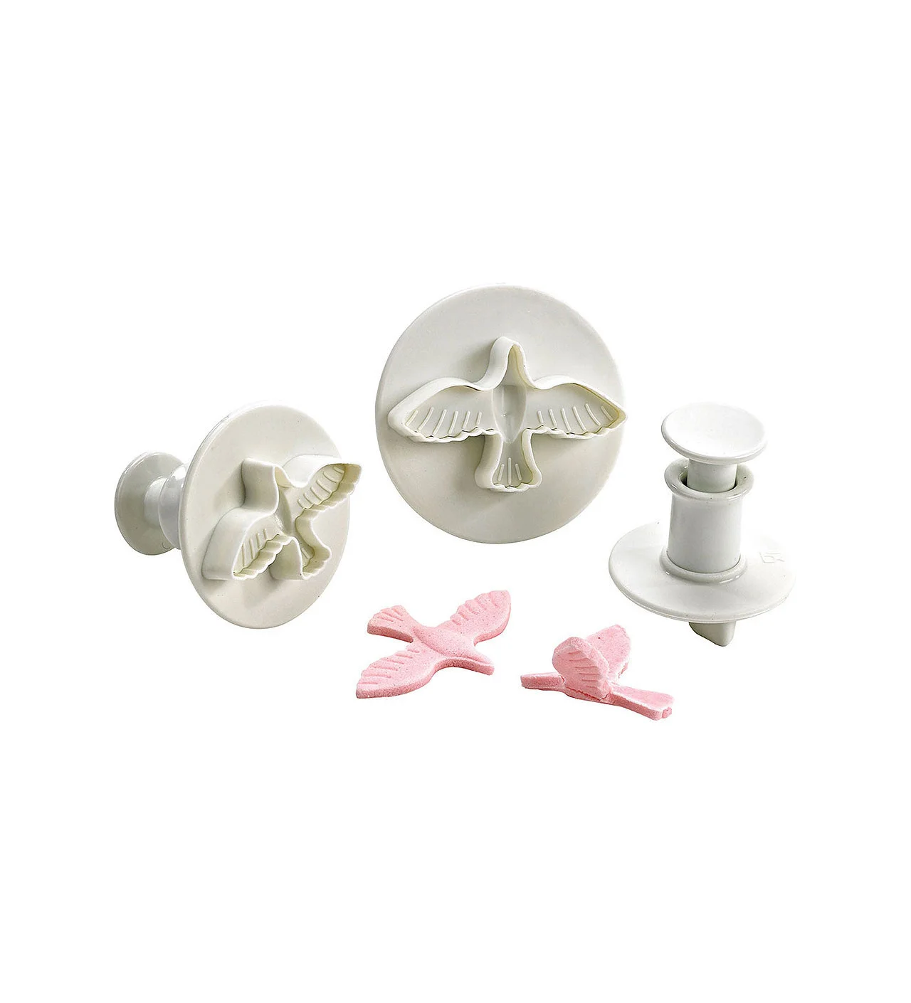 El set de cortadores de galletas está hecho por completo de plástico, lo que garantiza un agarre cómodo y una limpieza fácil. Presiona el cortador de galletas en el fondant y verás cómo quedan plasmados el cuerpo y las plumas de la paloma. Repliega con cuidado las alas hacia arriba para recrear la ilusión de movimiento.