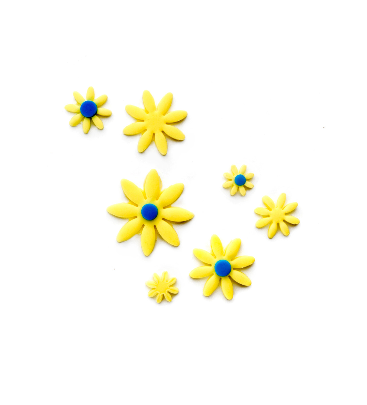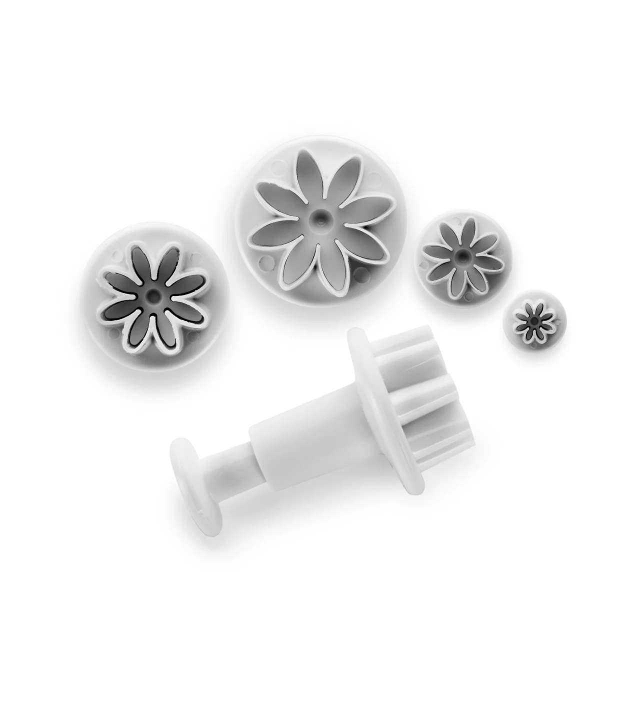 Decora tu pastel con margaritas de varios tamaños: 14/ 20 / 27 y 35 mm. Con estos cuatro cortapastas con expulsor de la marca Ibili podrás cortar la masa y expulsarla del cortador de galletas de un solo gesto.