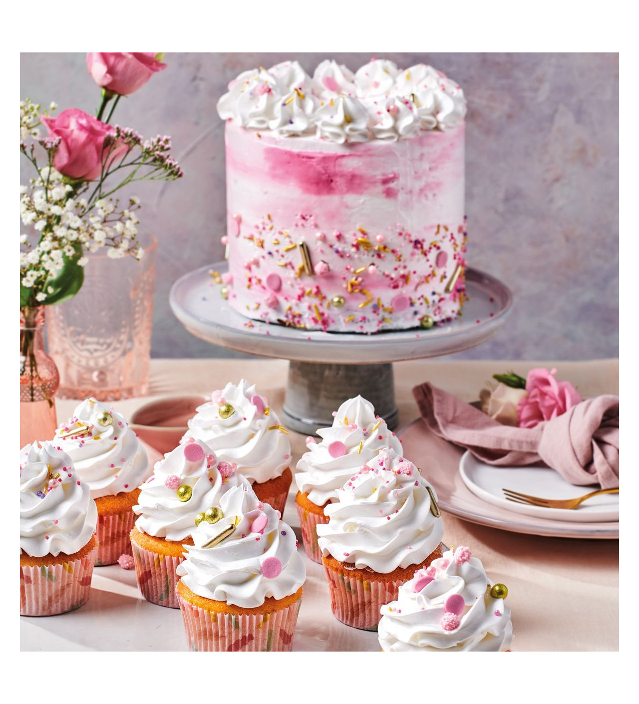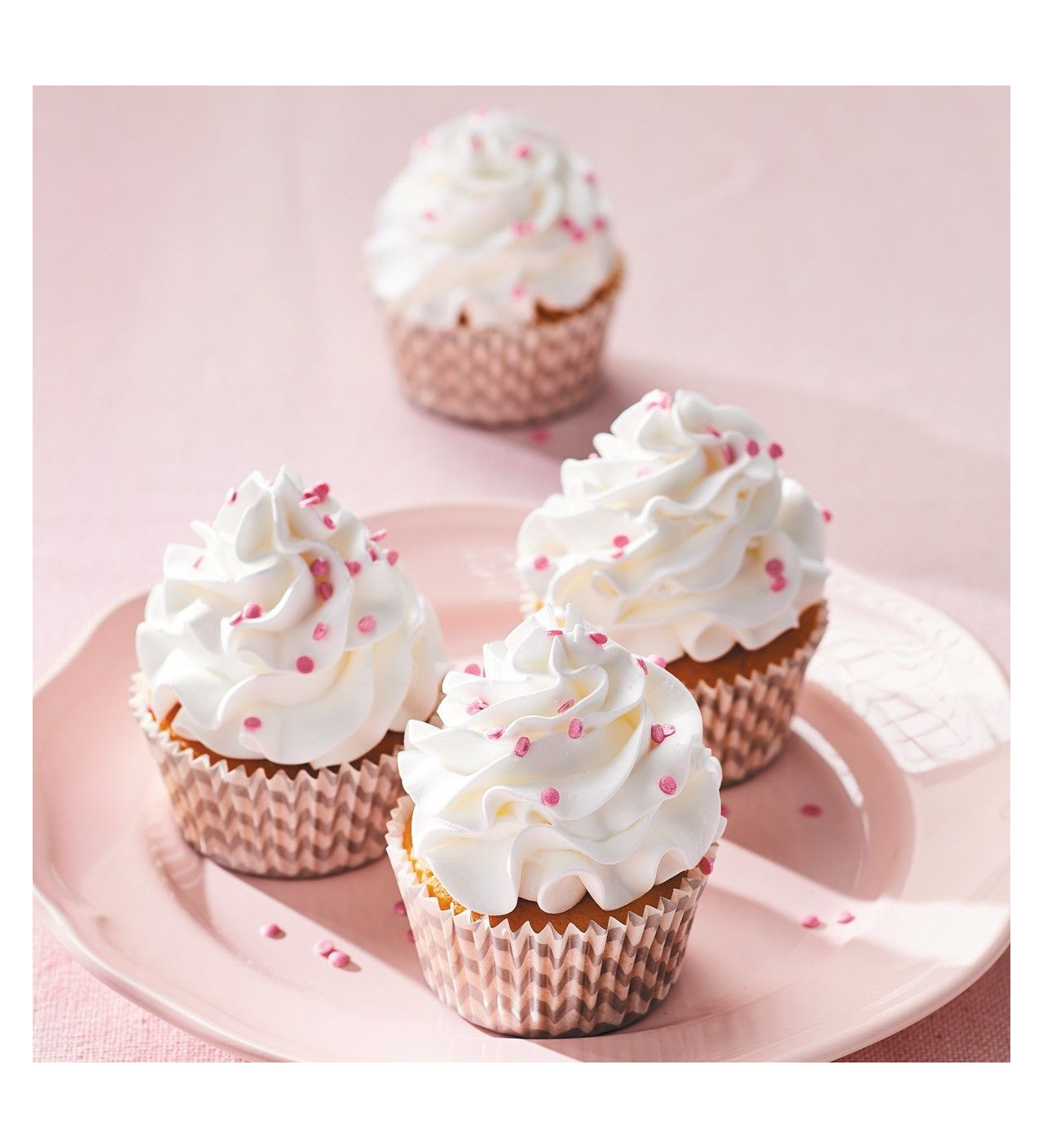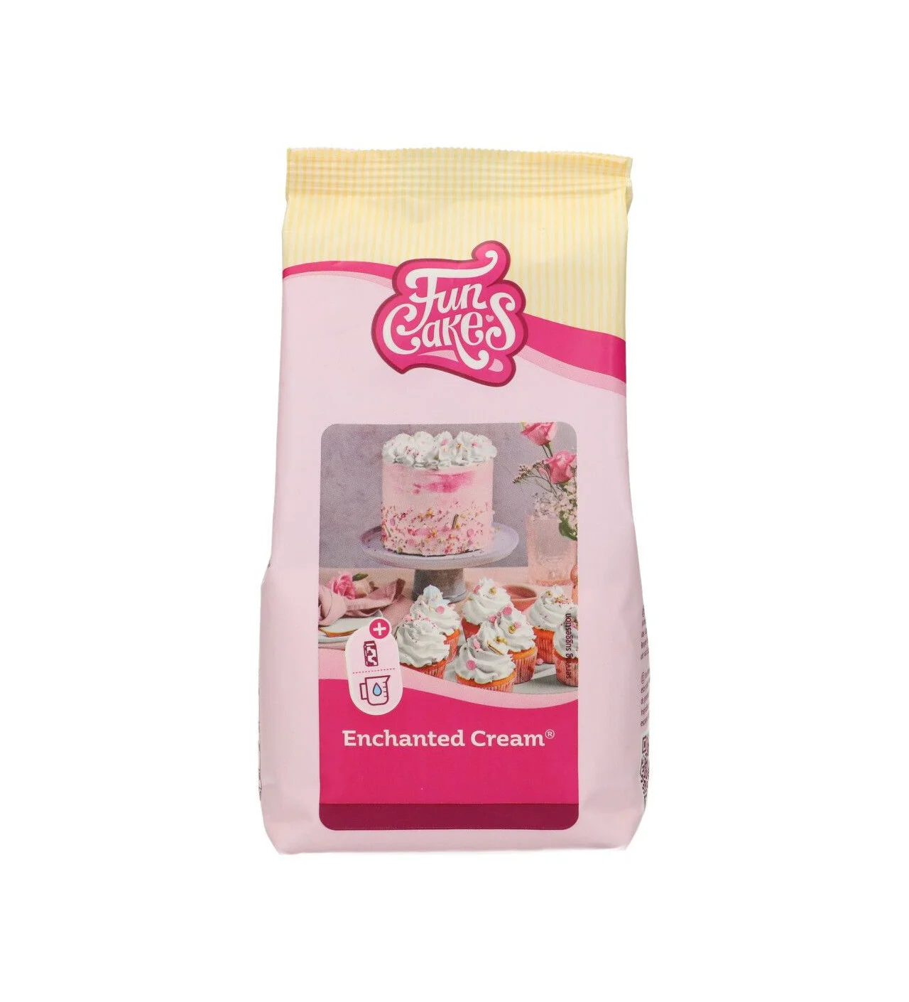 La crema encantada Funcakes es una alternativa a la crema chantilly u otras cremas que se usan tradicionalmente en la decoración de layer cakes o cupcakes. Esta crema en polvo te ayudará a conseguir una mezcla ligera y firme. Su sabor ligero garantiza una experiencia agradable y su textura firme sirve a la perfección para hacer elegantes espirales en tus postres.