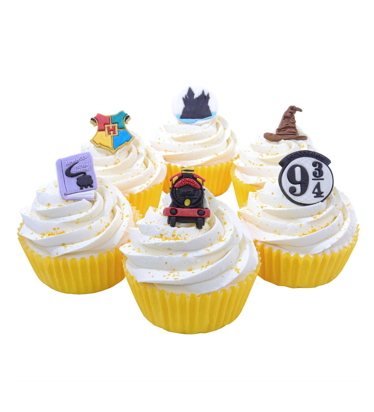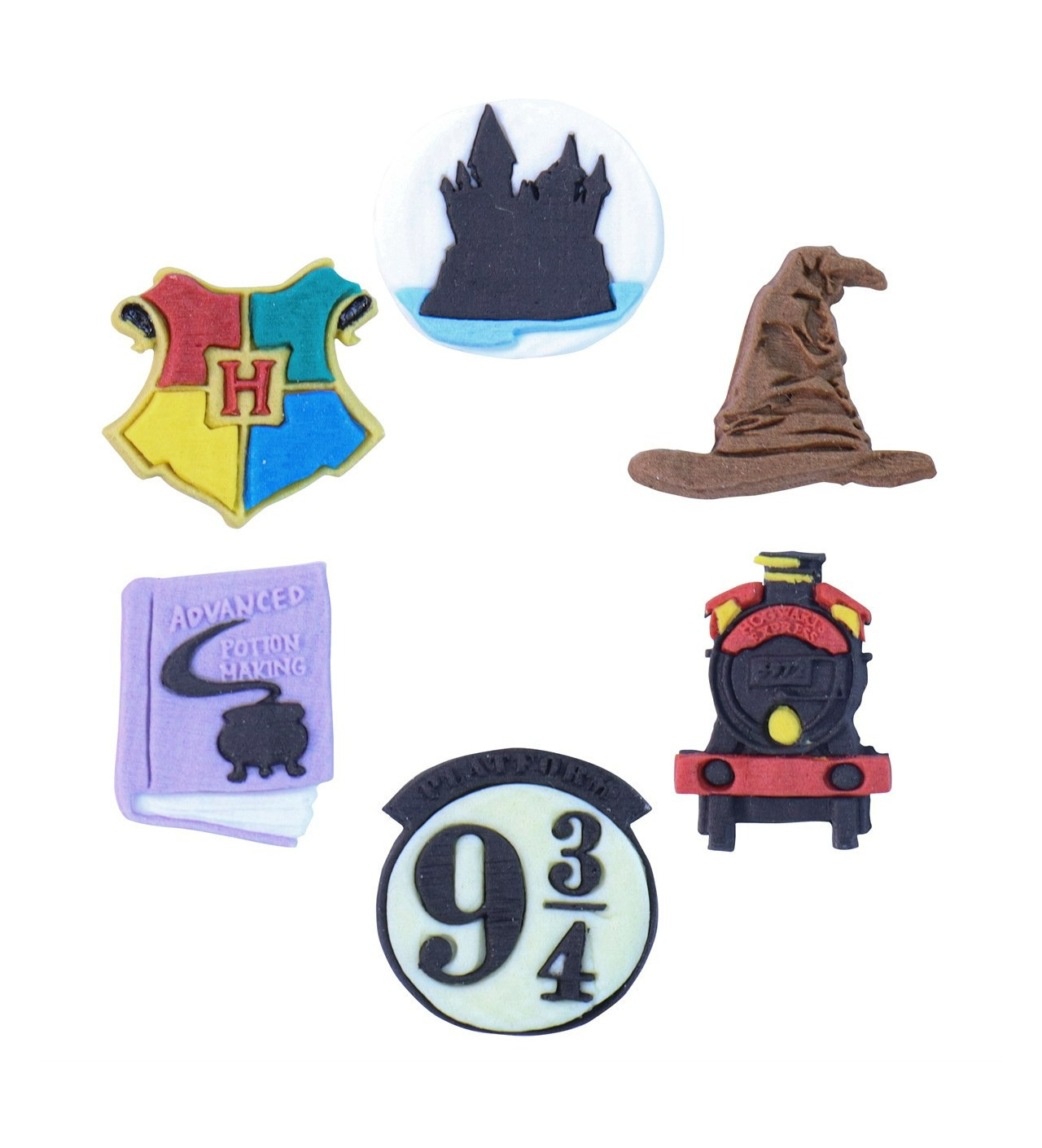 Las figuras de azúcar Harry Potter miden aproximadamente 3 cm y representan un elemento icónico del mundo mágico: el majestuoso castillo de Hogwarts, el misterioso Sombrero Seleccionador, el legendario Hogwarts Express, la famosa plataforma 9 ¾, un antiguo libro de hechizos y, por supuesto, el escudo de Hogwarts. Sin duda, entre esta decoración para tartas encontrarás los símbolos que harán las delicias de cualquier fan del universo mágico.