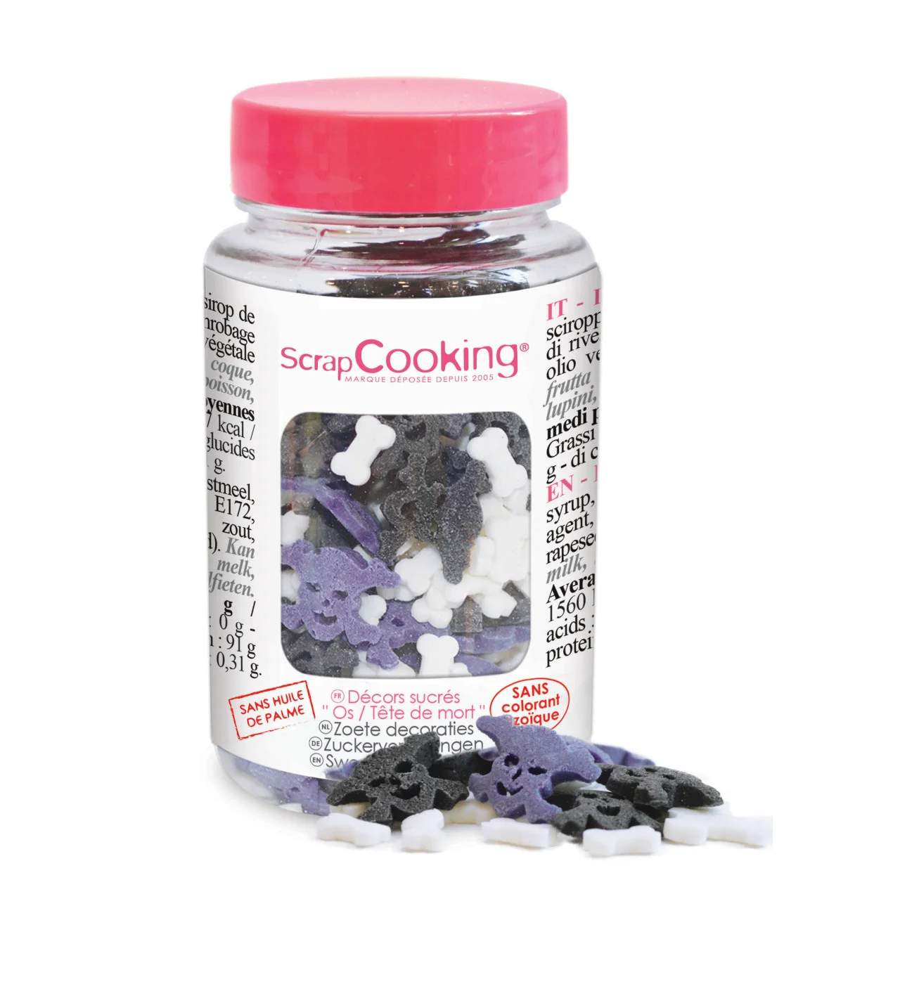 Prepara muffins, cupcakes o galletas terroríficamente deliciosas para tu fiesta de Halloween con las calaveras y huesos de azúcar incluidos en el frasco con cierre hermético. Las figuras de azúcar de Halloween de ScrapCooking, sin aceite de palma, asustarán a adultos y niños por igual.