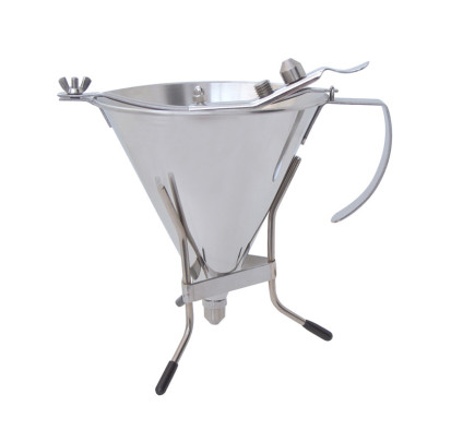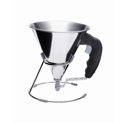 El embudo dosificador es ideal para preparar tanto platos calientes como fríos, y puede mantenerse en un baño maría sin problemas. Con una capacidad de 3.3 L y dos asas, es fácil de manejar ya que permite distribuir el peso de manera uniforme.
