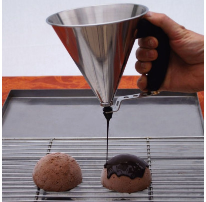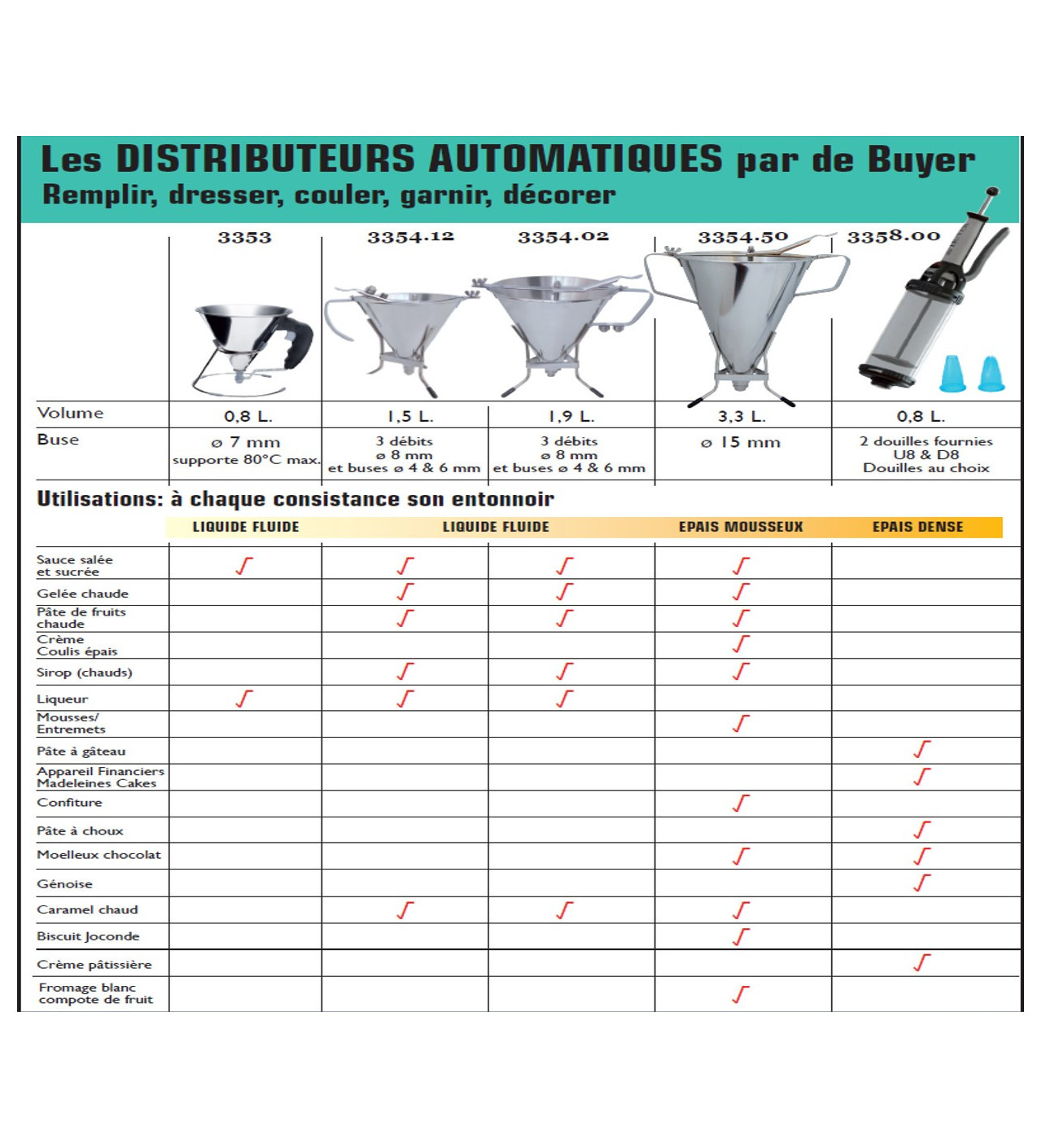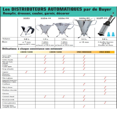 Además, este embudo de cocina incluye 2 boquillas extraíbles y una boquilla ancha de 15 mm de diámetro. Esto permite su uso en preparaciones líquidas (como crema inglesa), salsas consistentes (como coulis de frutas), preparaciones espesas (como bizcocho Joconde) o incluso salsas con trozos. Para sacar la preparación, basta con presionar el gatillo del embudo con el pulgar.