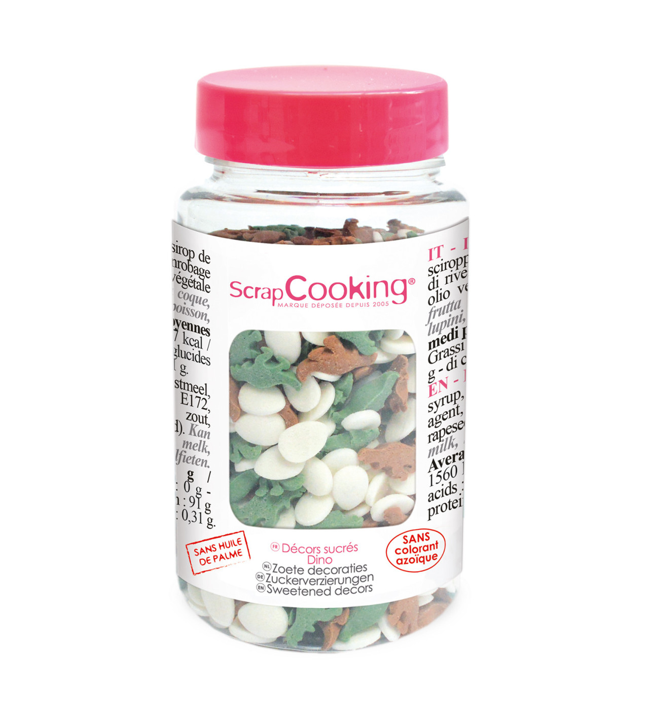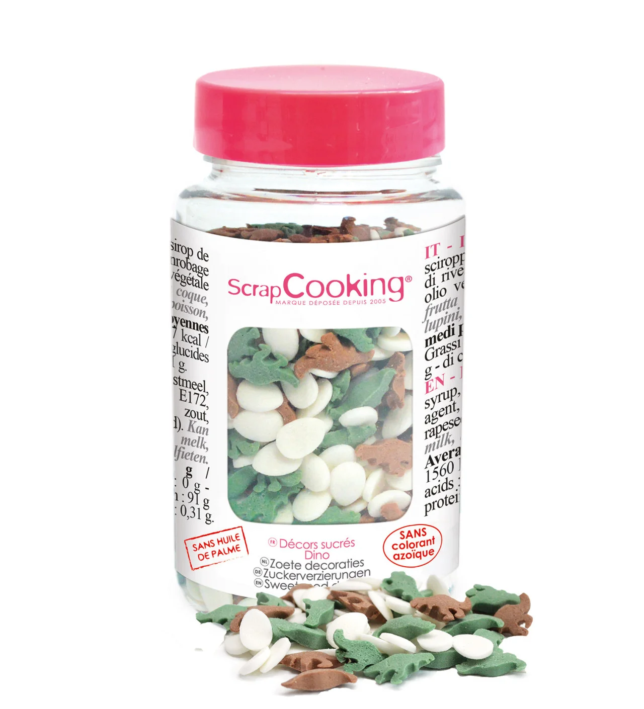 Para sublimar tus postres con una temática de dinosaurios, espárcele unas cuantas figuras de azúcar de la marca Scrapcooking. En este pequeño recipiente de 55 g encontrarás varios dinosaurios, al igual que sus huevos.