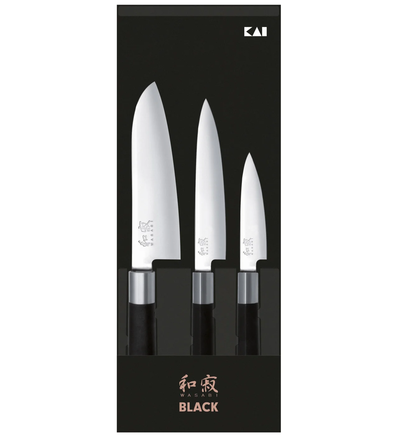 Juego de 3 Cuchillos Japoneses Puntilla 10 cm Multiuso 15 cm y Santoku 16,5 cm Wasabi Black Kai