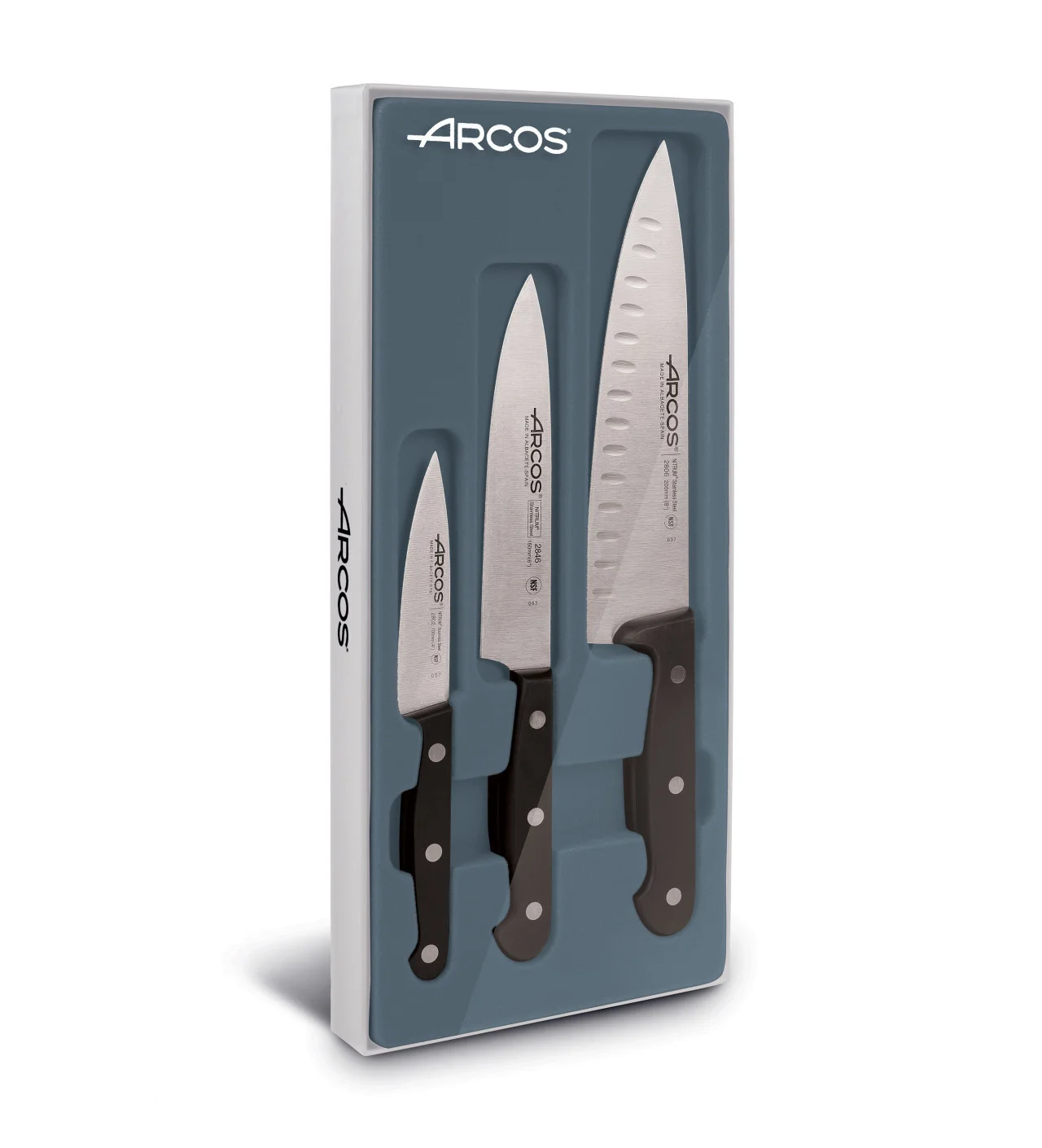 ¿Te has quedado sin ideas para regalar? El juego de cuchillos Arcos de la serie Universal es una apuesta segura: un set de cuchillos Arcos pensados para el día a día. Es el regalo ideal para cualquier amante de la cocina, ya que este set incluye los tres cuchillos más utilizados: un cuchillo mondador de 10 cm, un cuchillo de chef de 15 cm y otro cuchillo de chef de 20 cm.