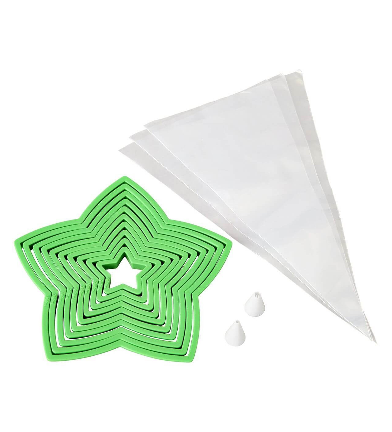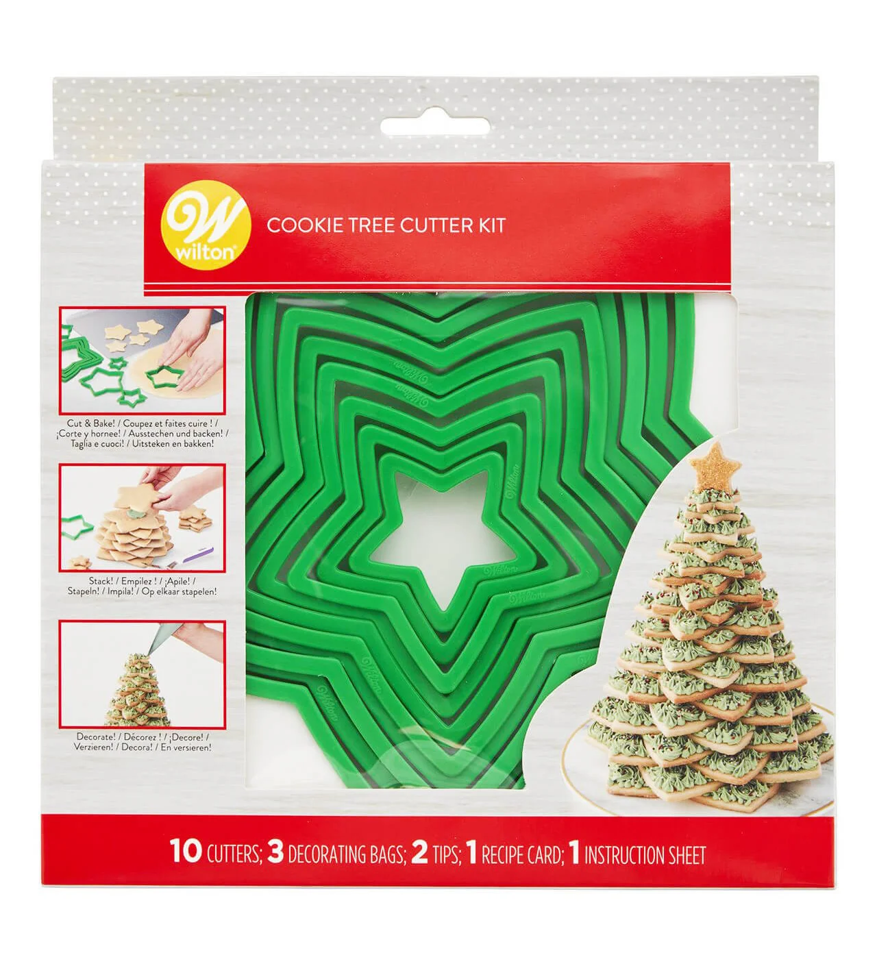 Crea un delicioso árbol de Navidad con el kit árbol de Navidad galleta Wilton: ¡Te prometemos que es muy fácil! El kit está compuesto de diez cortadores de galletas en forma de estrella de plástico, tres mangas pasteleras desechables y dos boquillas pasteleras en plástico. También encontrarás recetas en inglés para hacer el bizcocho y el glaseado.