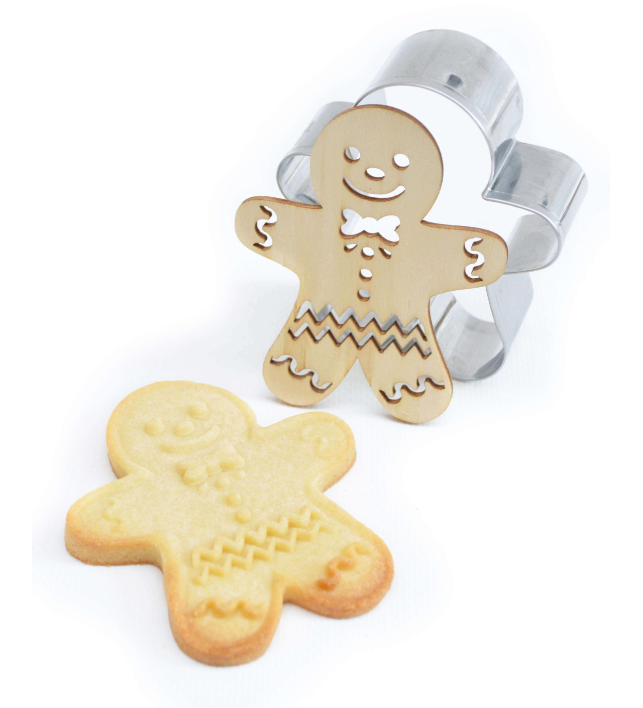 Para regalar o guardar en tu cocina, este kit galleta muñeco de jengibre es la solución ideal para hacer galletas de Navidad para fiestas con un toque de magia. Con el cortador para galletas podrás cortar eficazmente la masa para galletas con forma de hombre de jengibre. La segunda etapa consiste en utilizar el sello para galletas de madera natural, para estampar un hermoso diseño y así finalizar la decoración de la galleta. Última etapa: mételos en el horno después de haberlos puesto en el refrigerador para que el diseño destaque correctamente después de la cocción.