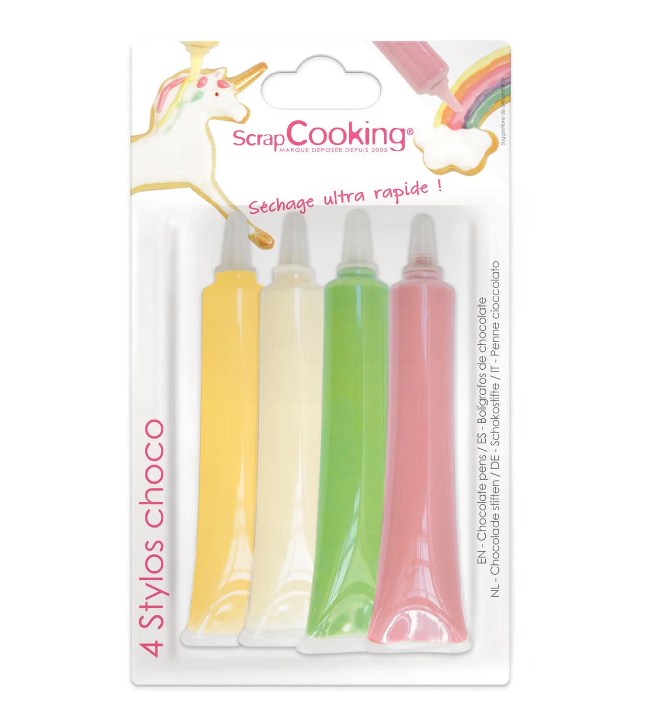 Los 4 lápices para decorar galletas con glasa de chocolate de ScrapCooking aportan un toque de color a tus decoraciones, así como un extra de sabor gracias al delicioso chocolate. Son ideales para decorar galletas de arcoíris o unicornio. Además, el glaseado blanco, rosa, verde y amarillo se seca rápidamente (en menos de 2 minutos), garantizando que los detalles se mantengan intactos hasta la hora de degustarlos.
