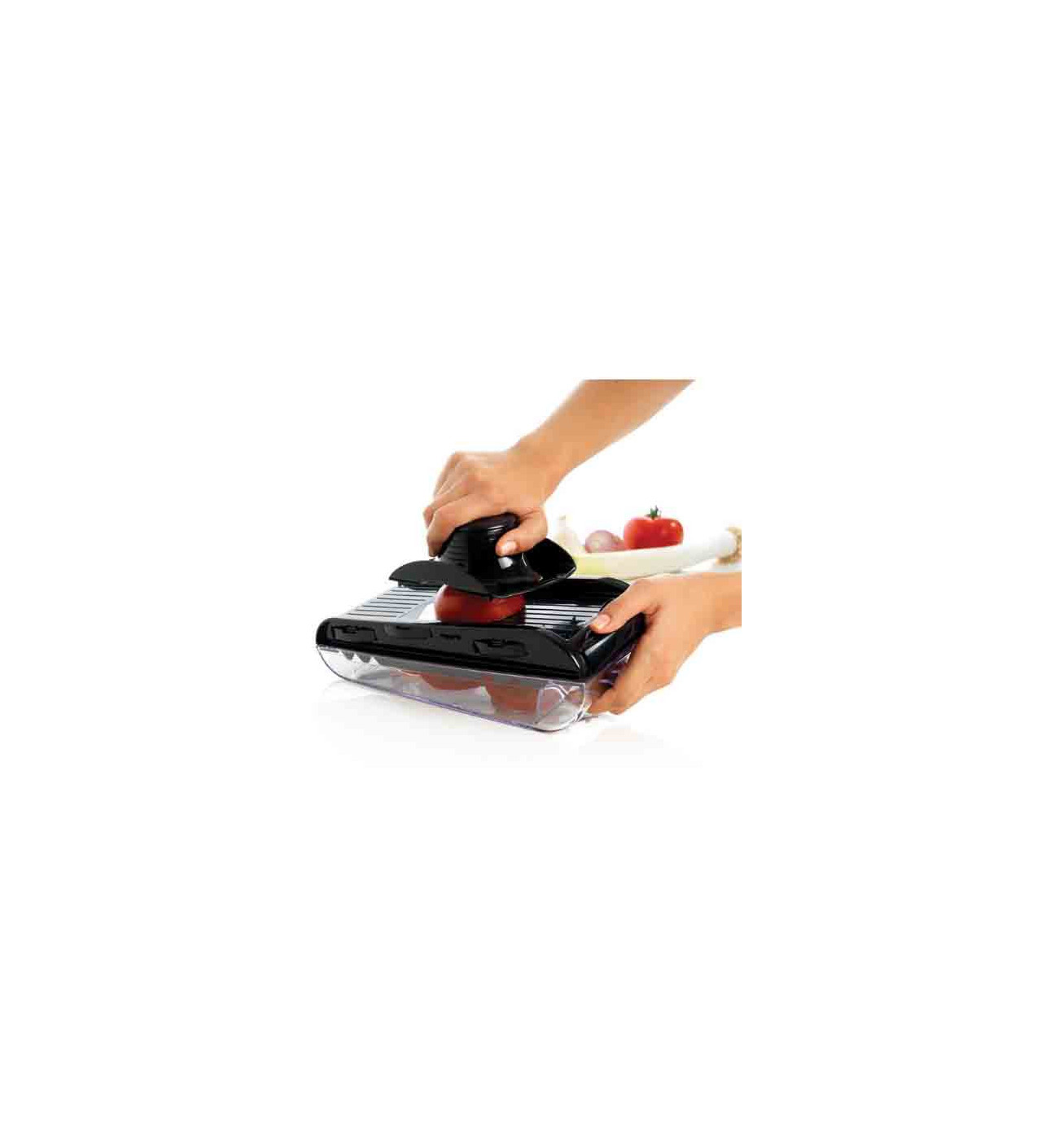 El protector de corte de la mandolina para cortar verduras Mastrad tiene también un pulsador que permite cortar los alimentos enteros.