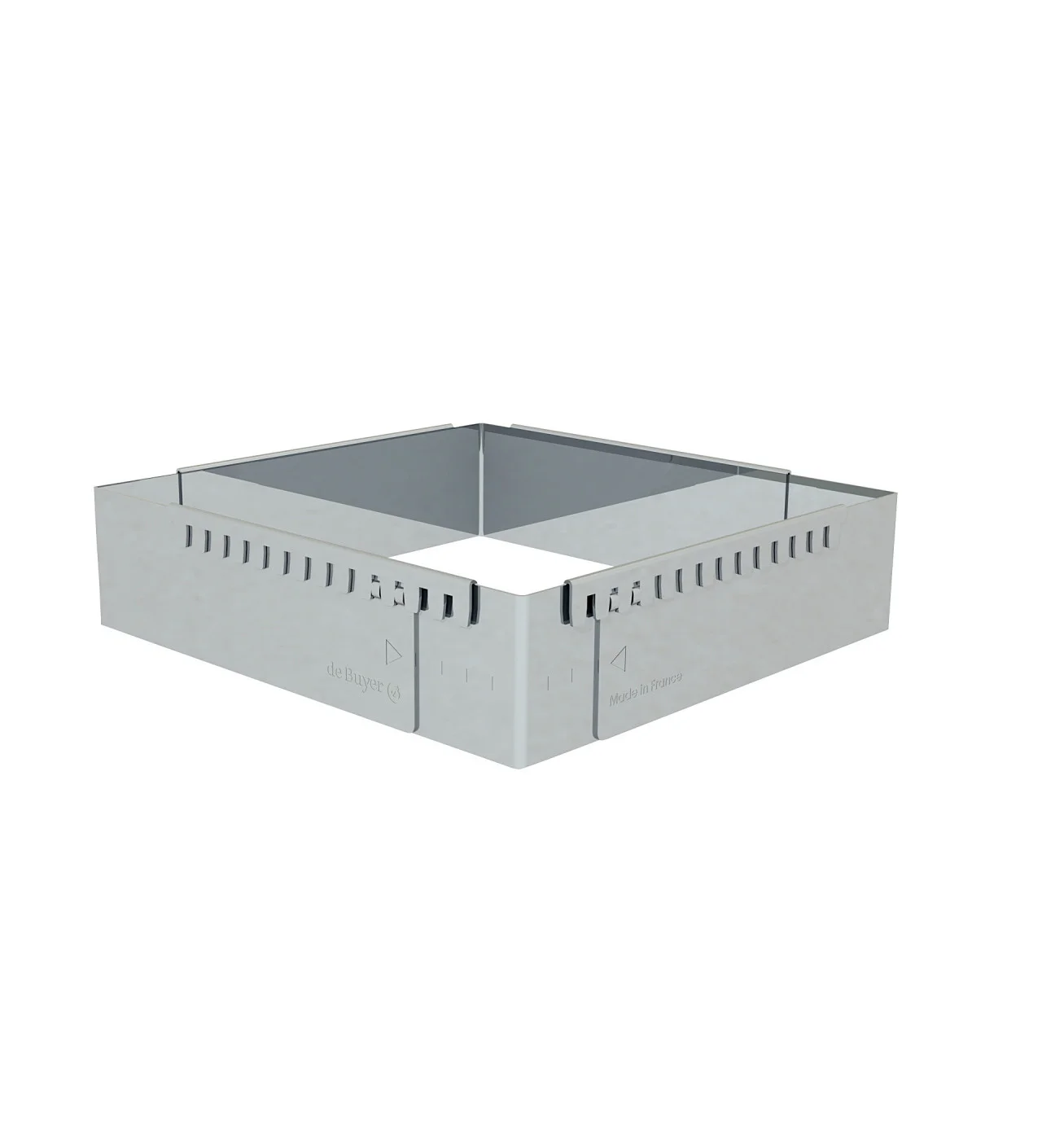 Al ser de calidad profesional, el marco pastelería extensible de la marca de Buyer cumple con las exigencias de chefs y aficionados. Hecho completamente de acero inoxidable flexible y muy resistente, este marco pastelería de la marca de Buyer mide 16 x 16 cm y puede extenderse hasta alcanzar 30 x 30 cm, con una altura de 5 cm. Para ello, el marco de acero inoxidable de la marca de Buyer cuenta con muescas de fijación en el exterior y en la parte superior: así que los bordes de tu masa quedarán perfectamente prolijos.