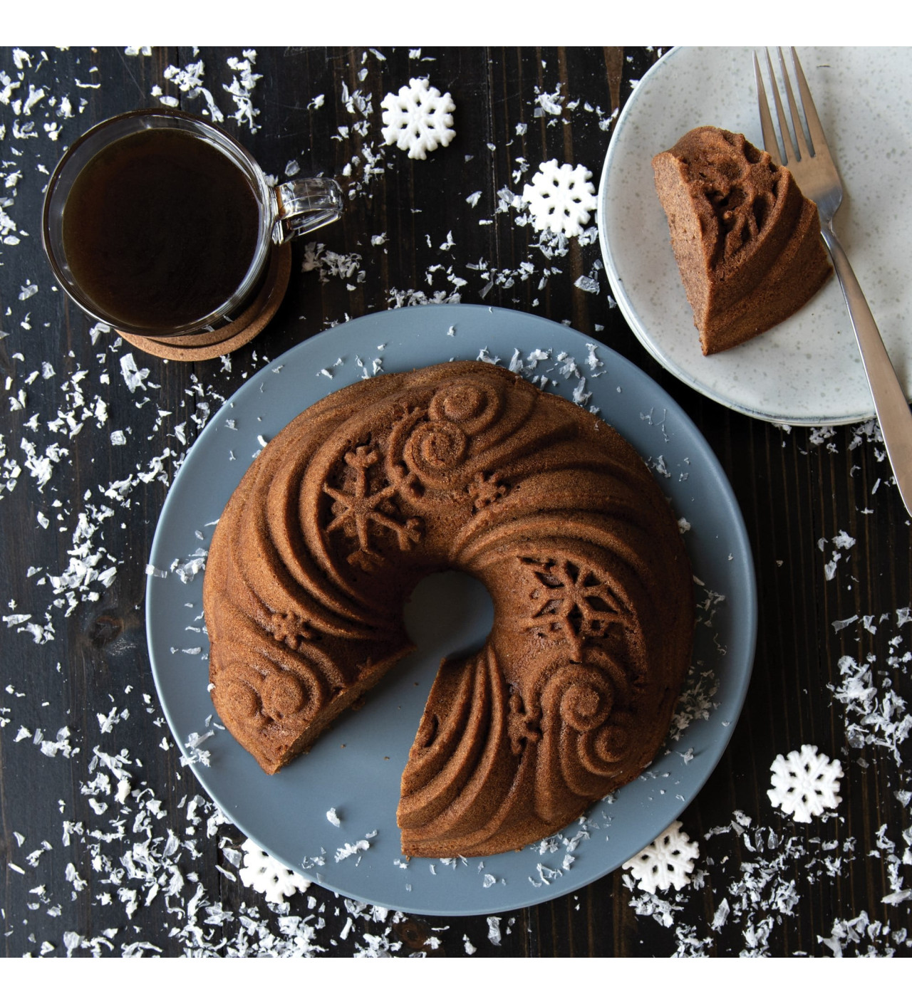 Por último, deja que el azúcar glas caiga como la nieve y recubra el bizcocho o, si prefieres, delinea el contorno de los copos de nieve con lápices pasteleros o glaseado. En cuanto lo sirvas, el bizcocho Bundt tendrá un porte magnífico que cautivará los ojos de tus invitados.
