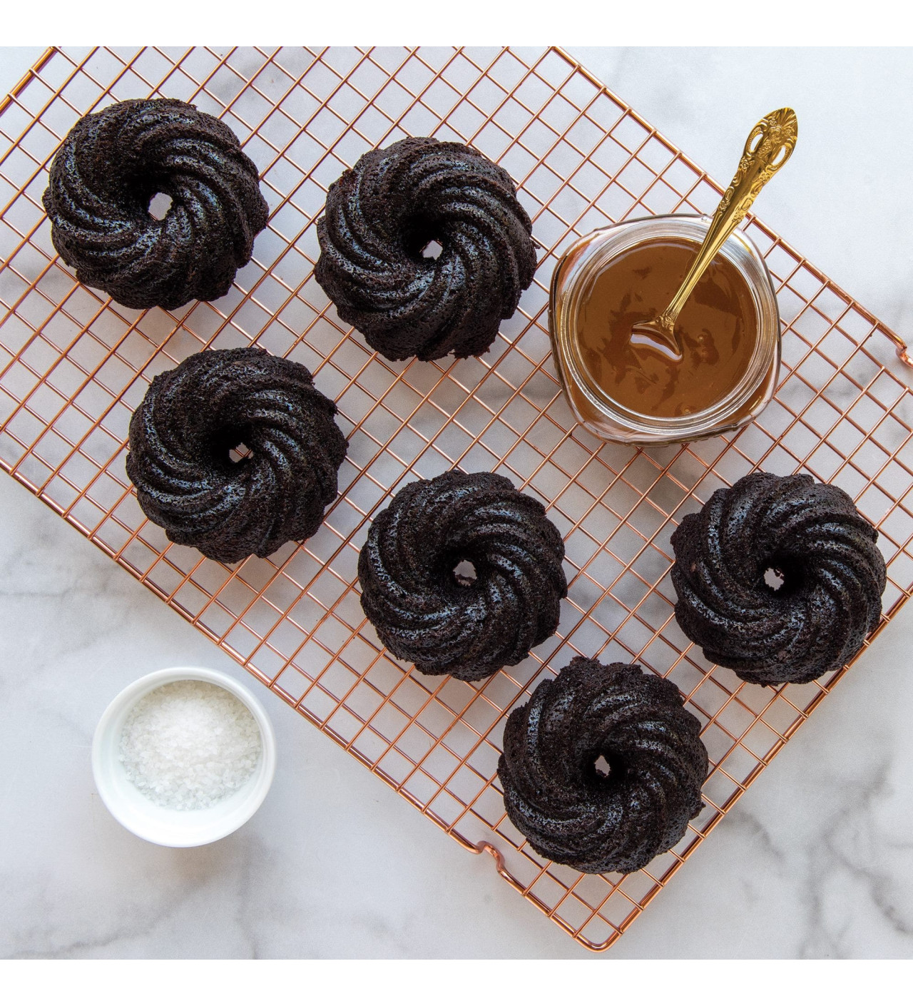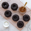 Sumérgete en manjares que te harán girar de felicidad con este elegante molde swirl Bundltette Nordic Ware de seis cavidades.