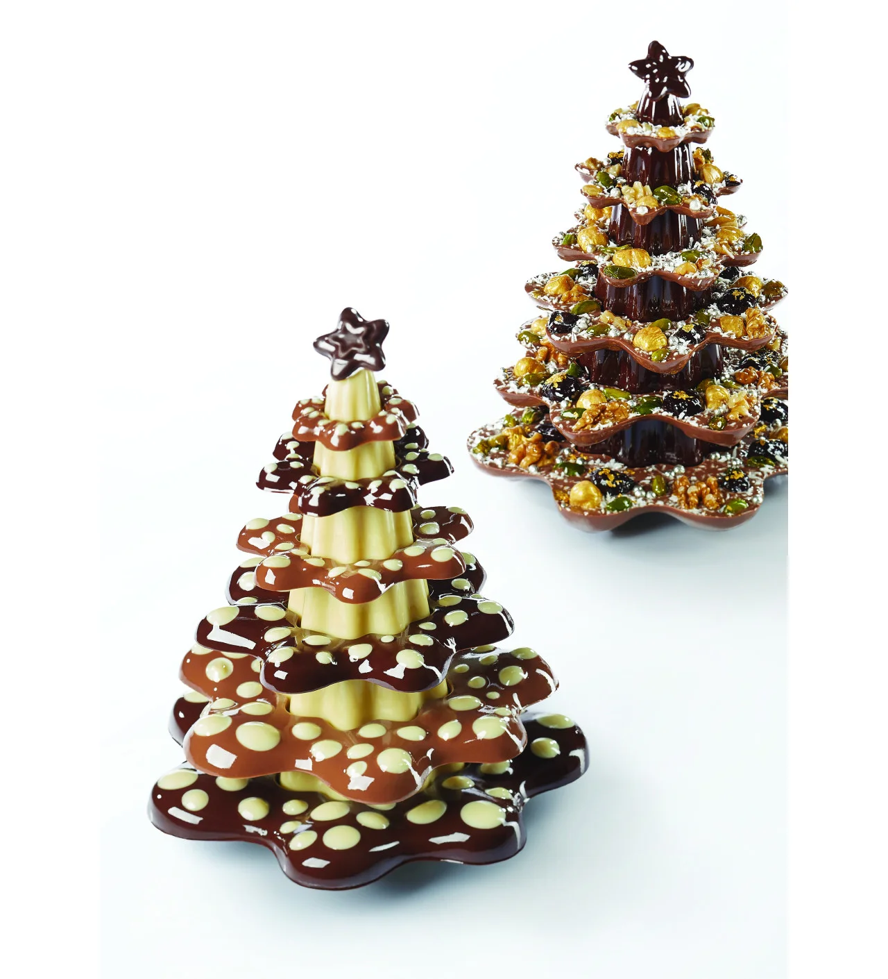 Cuando tu chocolate se ha cristalizado y encogido ligeramente, procede al desmoldado volteando lentamente tu molde para chocolate. Pon los aros de chocolate sobre la base del más grande al más pequeño. Por último, coloca la estrella de chocolate con un poco de chocolate atemperado, como si estuvieras colocando la estrella en la copa de tu árbol de Navidad.