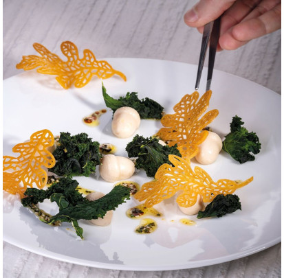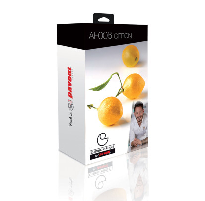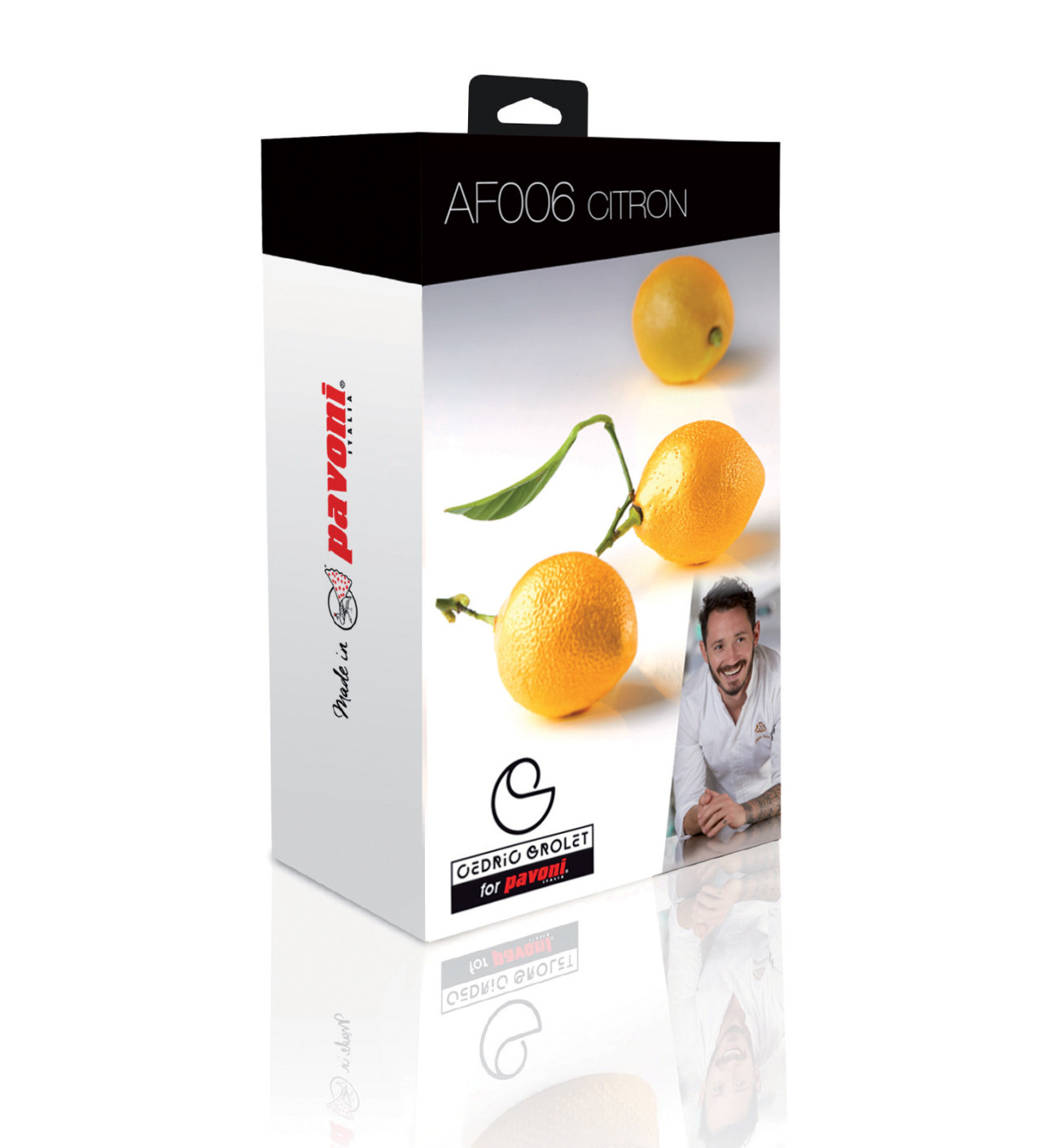 El chef pastelero Cédric Grolet se ha asociado con la marca Pavoni para ofrecernos una colección que gira en torno a tres frutas: la castaña, la avellana y el limón. Cada una de estas frutas está disponible en una serie de tres moldes: individual, para compartir y para decorar tartas. He aquí el molde de silicona de porciones individuales en forma de limón.