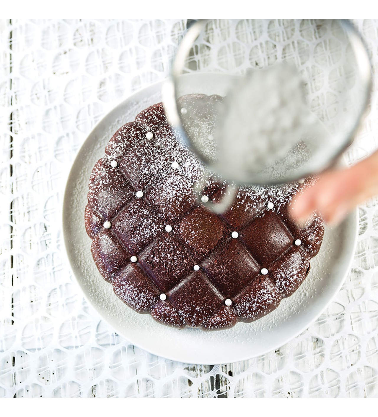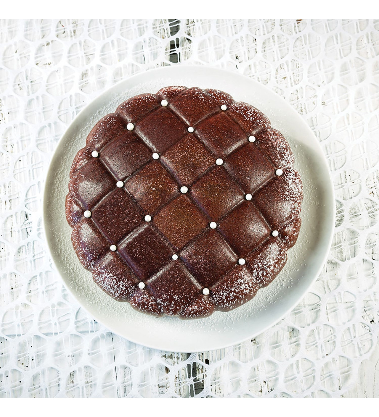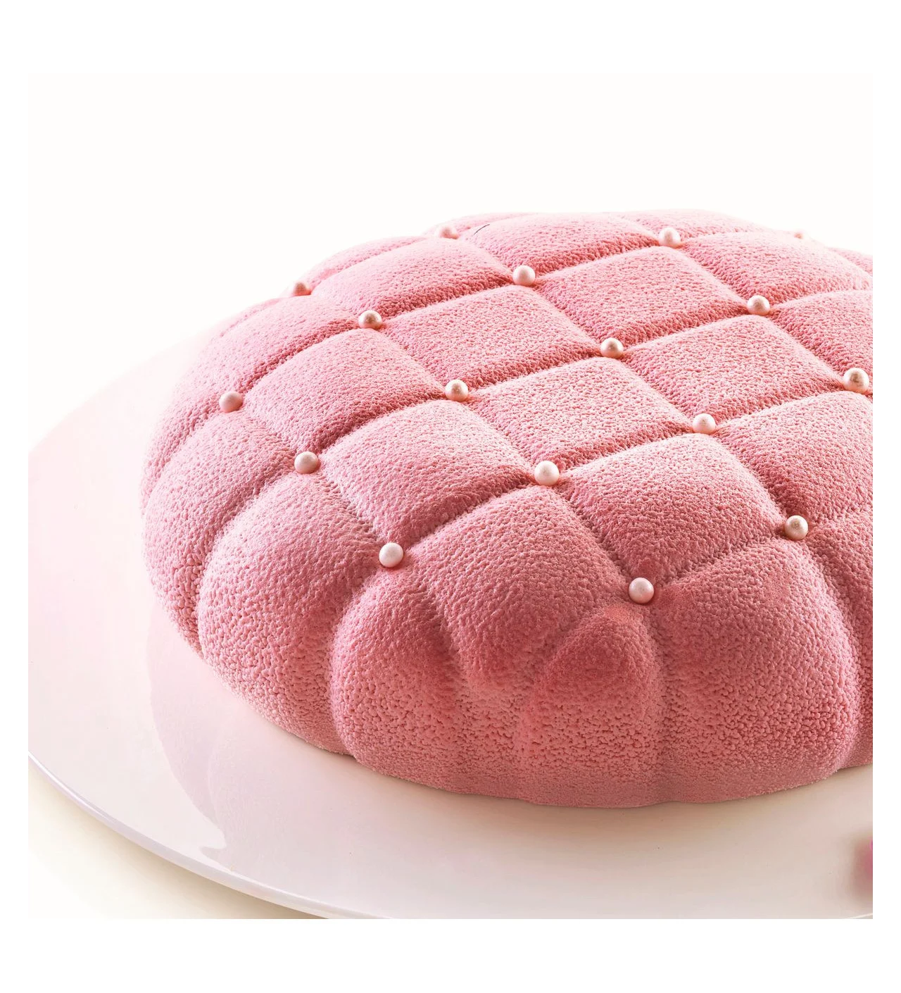 Para resaltar el motivo acolchado del molde de silicona para repostería, ¿Por qué no optar por un colorante alimentario en espray? Este le dará un efecto terciopelo elegante. ¡Termina por añadir unas perlas de azúcar y disfruta!