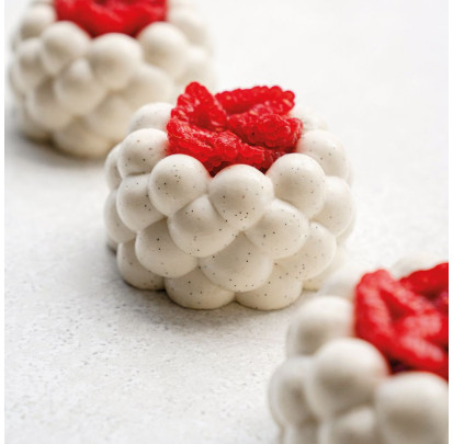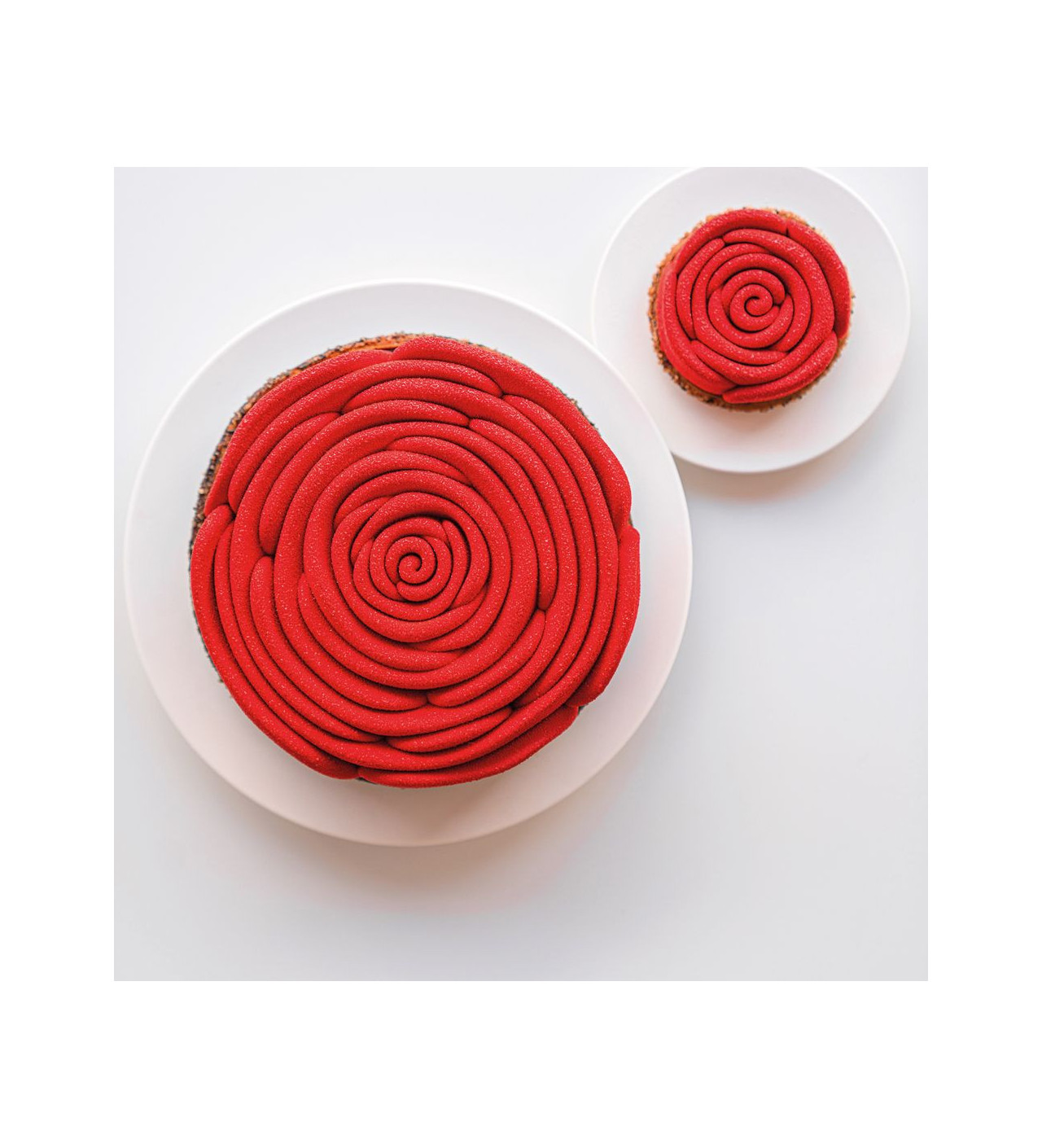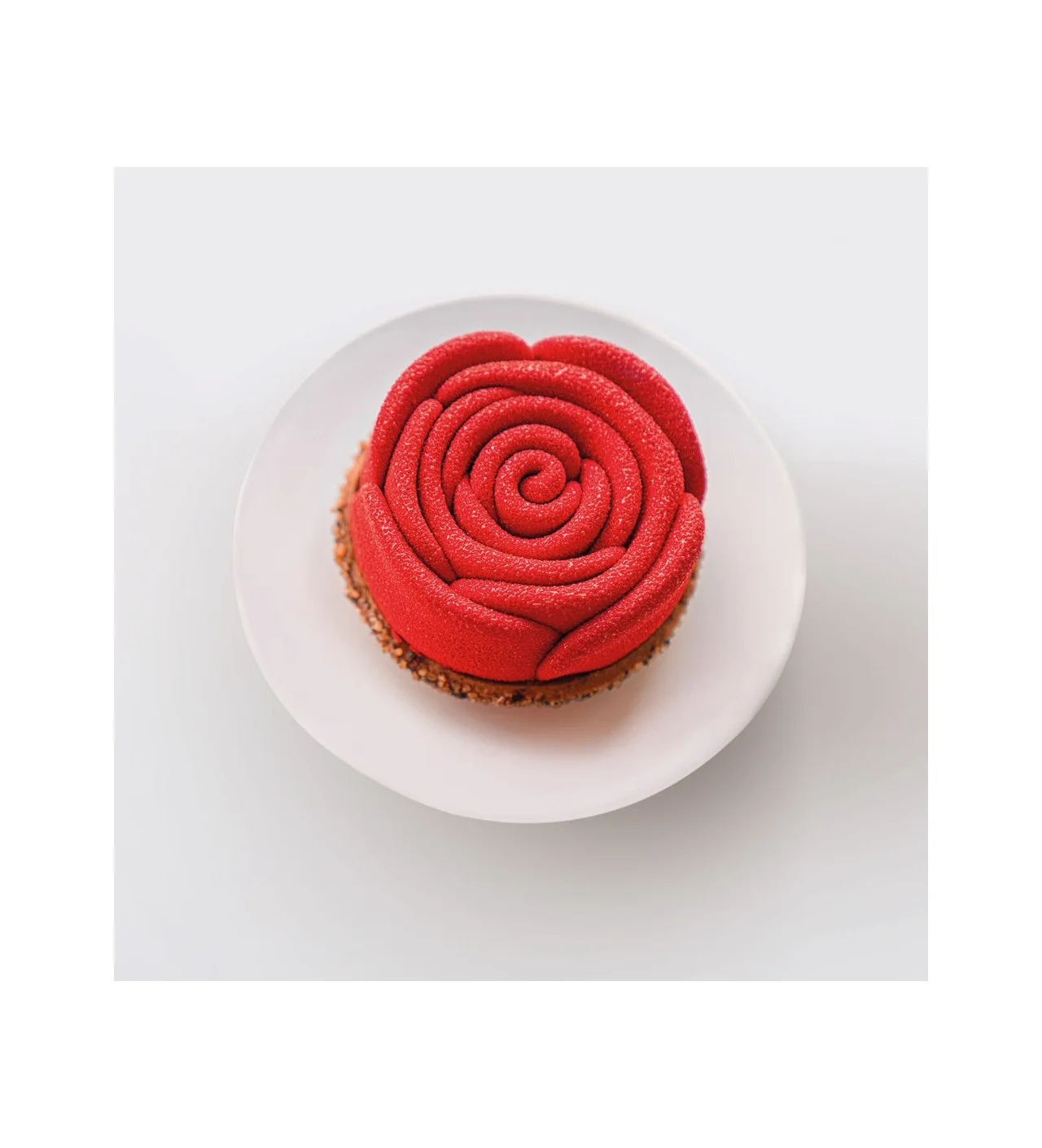 Cuando tu entremets (o cualquier otro pastel) esté desmoldado, solo te queda decorar esta rosa y sus pétalos elegantes. Glaseado, colores brillantes, efecto de rocío con jarabe o piping gel, eres la mente maestra de tus creaciones. Realiza tus más hermosos postres con el molde silicona.