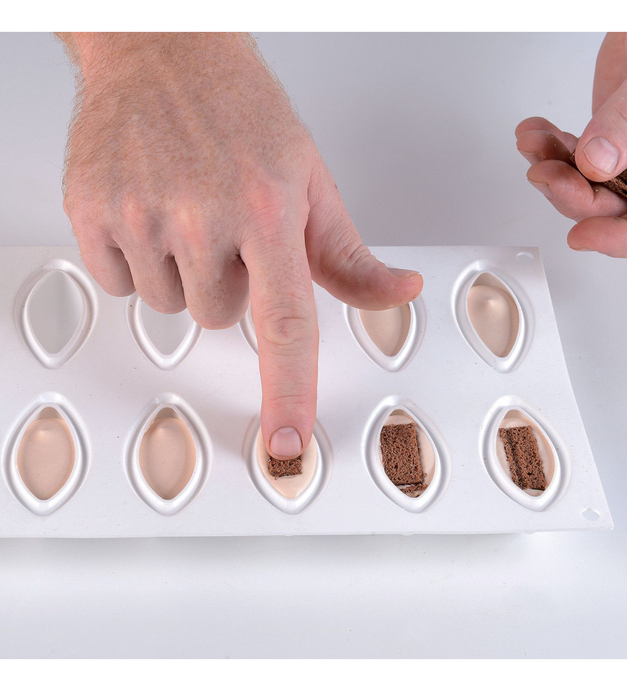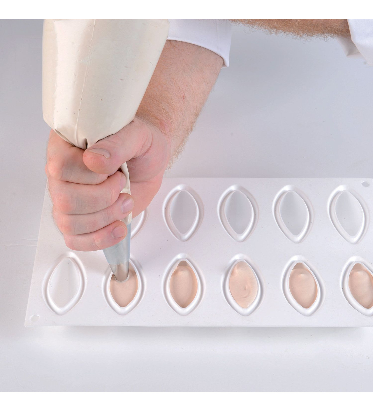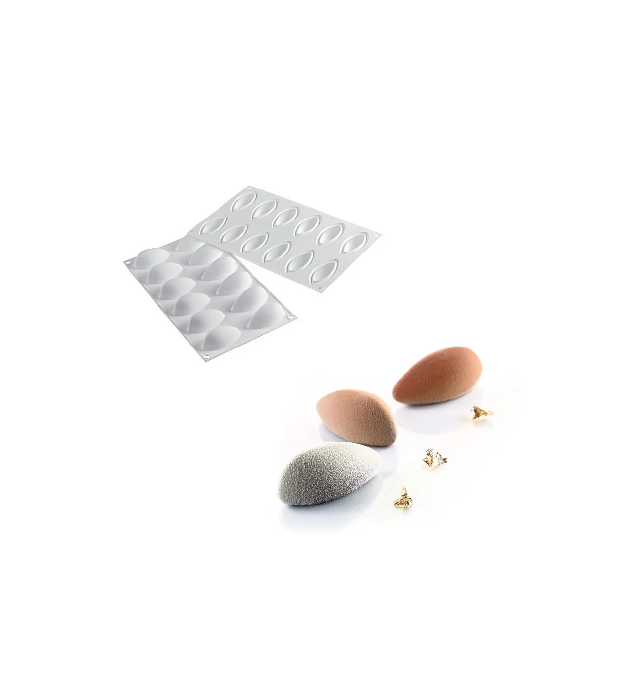 El molde silicona SilikoMart tiene 12 cavidades con bordes diseñados para darles a tus quenelles una hermosa forma redondeada en su base. También puedes utilizarlo para realizar rellenos o decoraciones para tus pasteles. El molde SilikoMart se distingue por su versatilidad, en efecto, se adapta al horno, al microondas o incluso al frigorífico por lo que podrás preparar quenelles frías o calientes. Por último, para que tus quenelles sean más elegantes que nunca, cúbrelas con un delicado glaseado espejo o con un espray terciopelo.