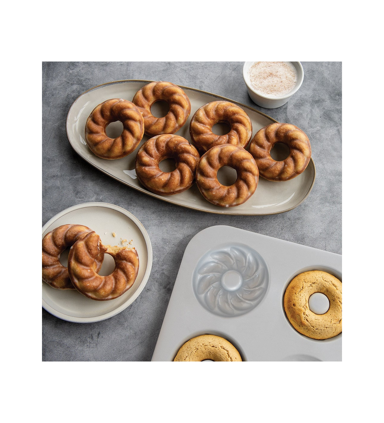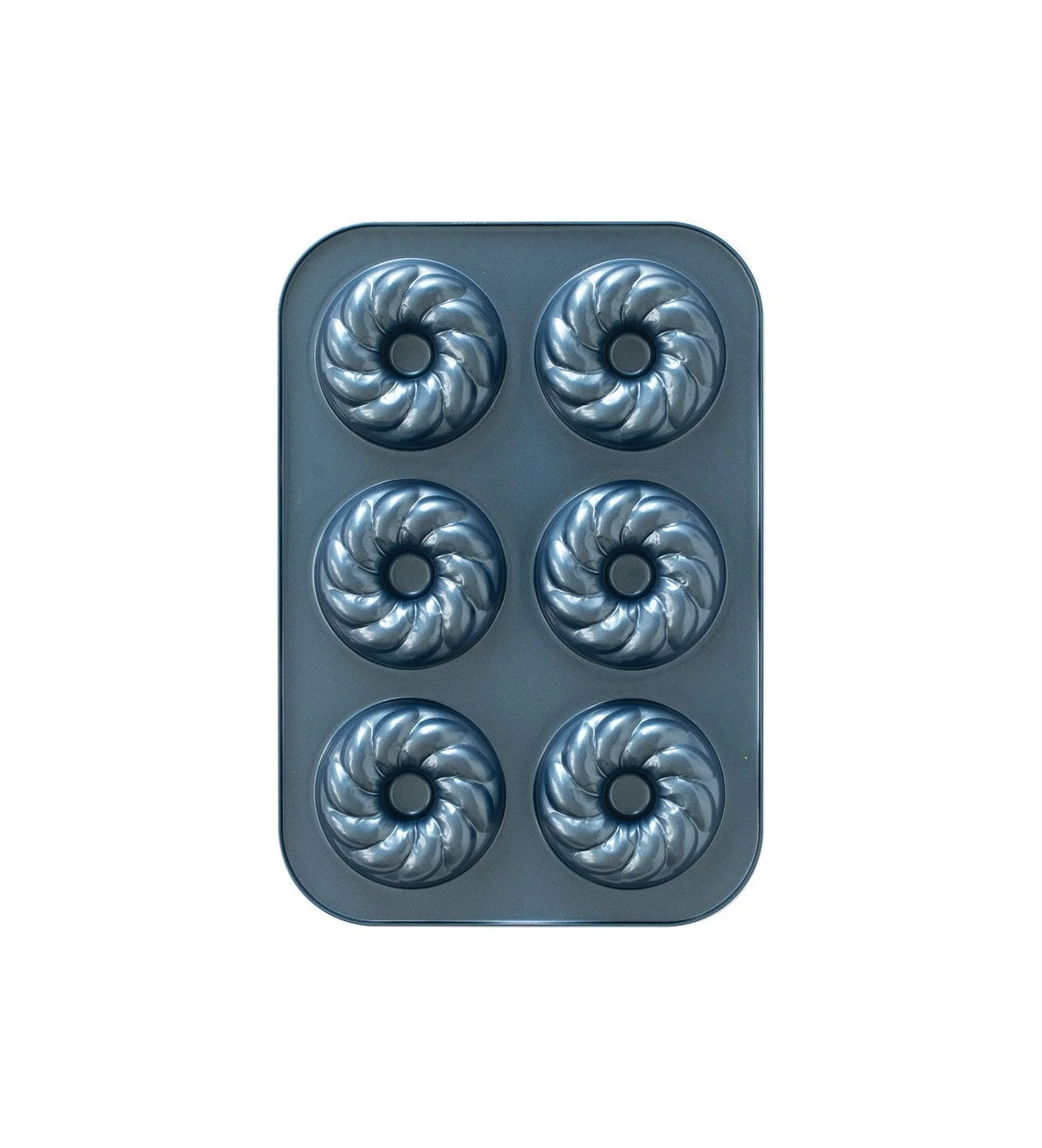 Este molde donuts con seis cavidades es perfecto para porciones individuales. Disfruta de unos deliciosos postres a la hora del café con el molde french twist donuts pan.