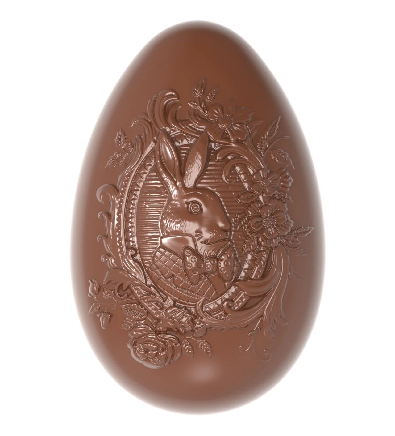 Inspirado el universo de Lewis Carroll, el molde huevo de chocolate de la marca Chocolate World exhibe un medallón estilo rococó con el perfil de un conejo. El molde para chocolate tiene 6 cavidades que miden 86,50 x 56,50 x 33,50 mm.