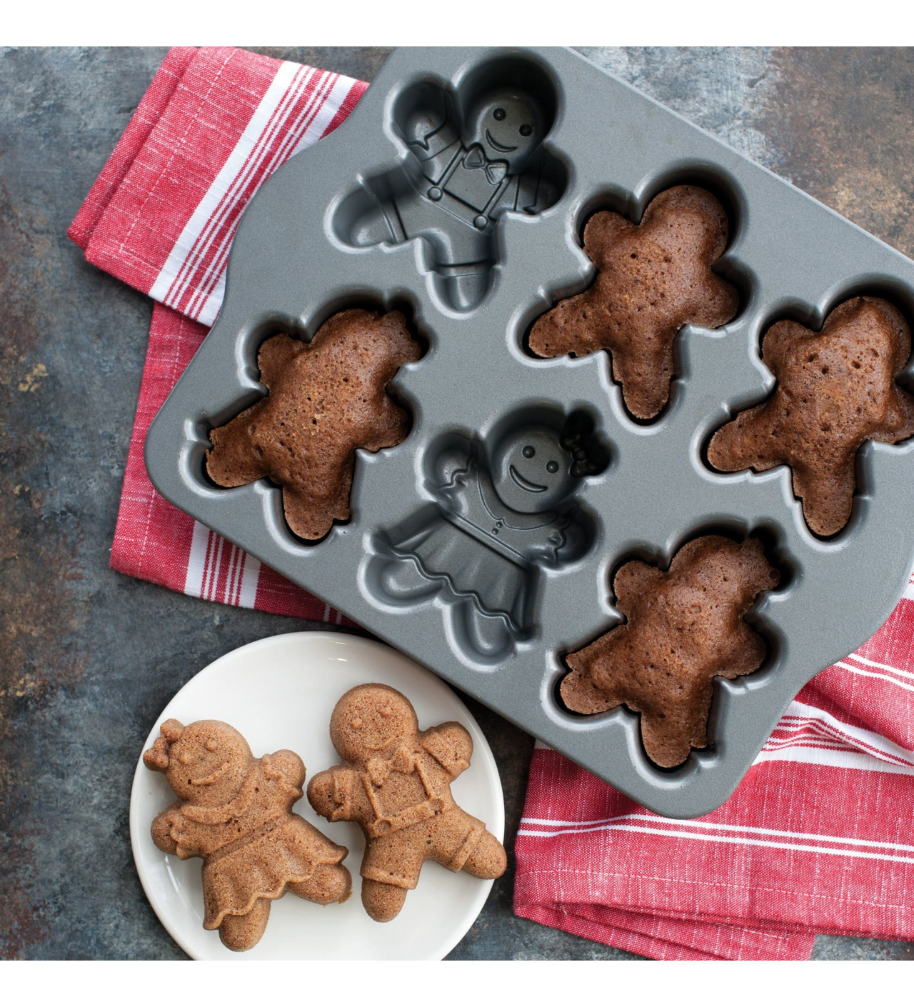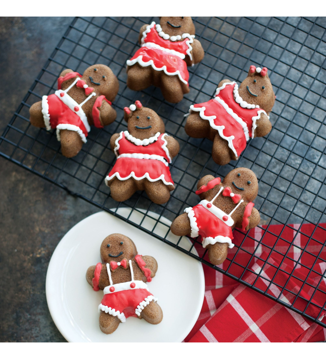 Conviértete en un verdadero pastelero y prepara excepcionales hombres de jengibre con el molde para bizcocho Nordic Ware. Posee seis cavidades en forma de hombres de jengibre en elegantes vestidos que podrás usar para que tus invitados pasen un momento mágico y sabroso.