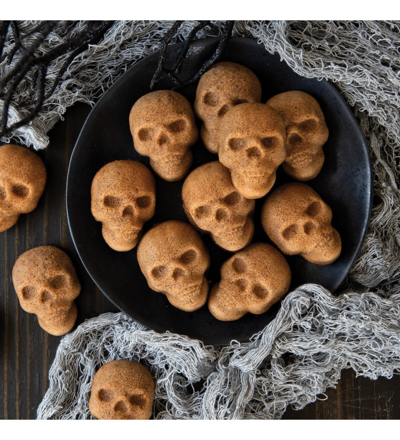 ¿Alcanzas a escuchar la carcajada burlona de una bruja que prepara sus hechizos? Halloween se acerca rápidamente y llega acompañado de caramelos y muchos dulces. Añade un toque aterrador a tus entradas, platos y postres con bizcochitos en forma de calaveras pequeñas.
