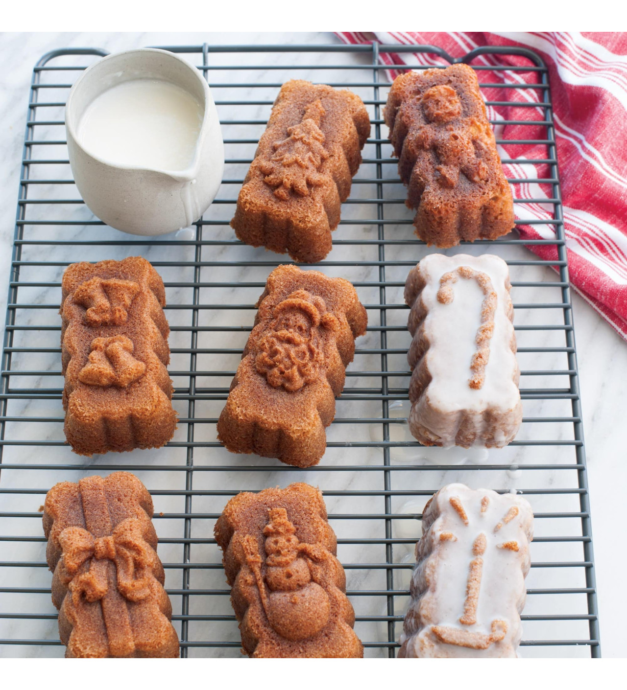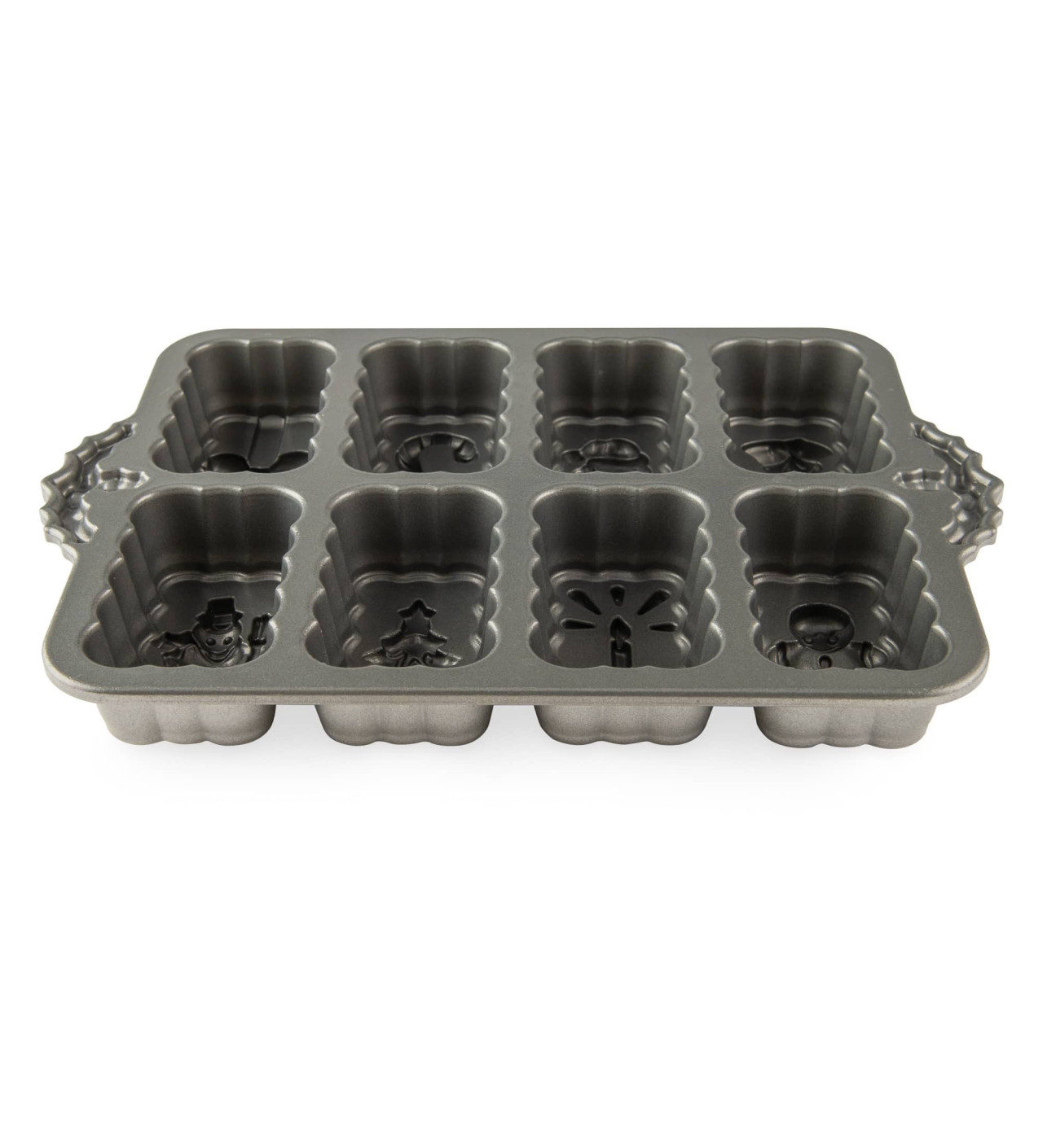 Con este molde Nordic Ware de 8 cavidades puedes hacer una sola masa para todos tus postres o escoger un sabor especial para cada bizcocho, ¡tú escoges! Sea cual sea tu elección, crearás deliciosos mini bizcochos navideños con motivos detallados: regalo, muñeco de nieve, hombre de jengibre, árbol de Navidad, vela, bastón de caramelo o Papá Noel.