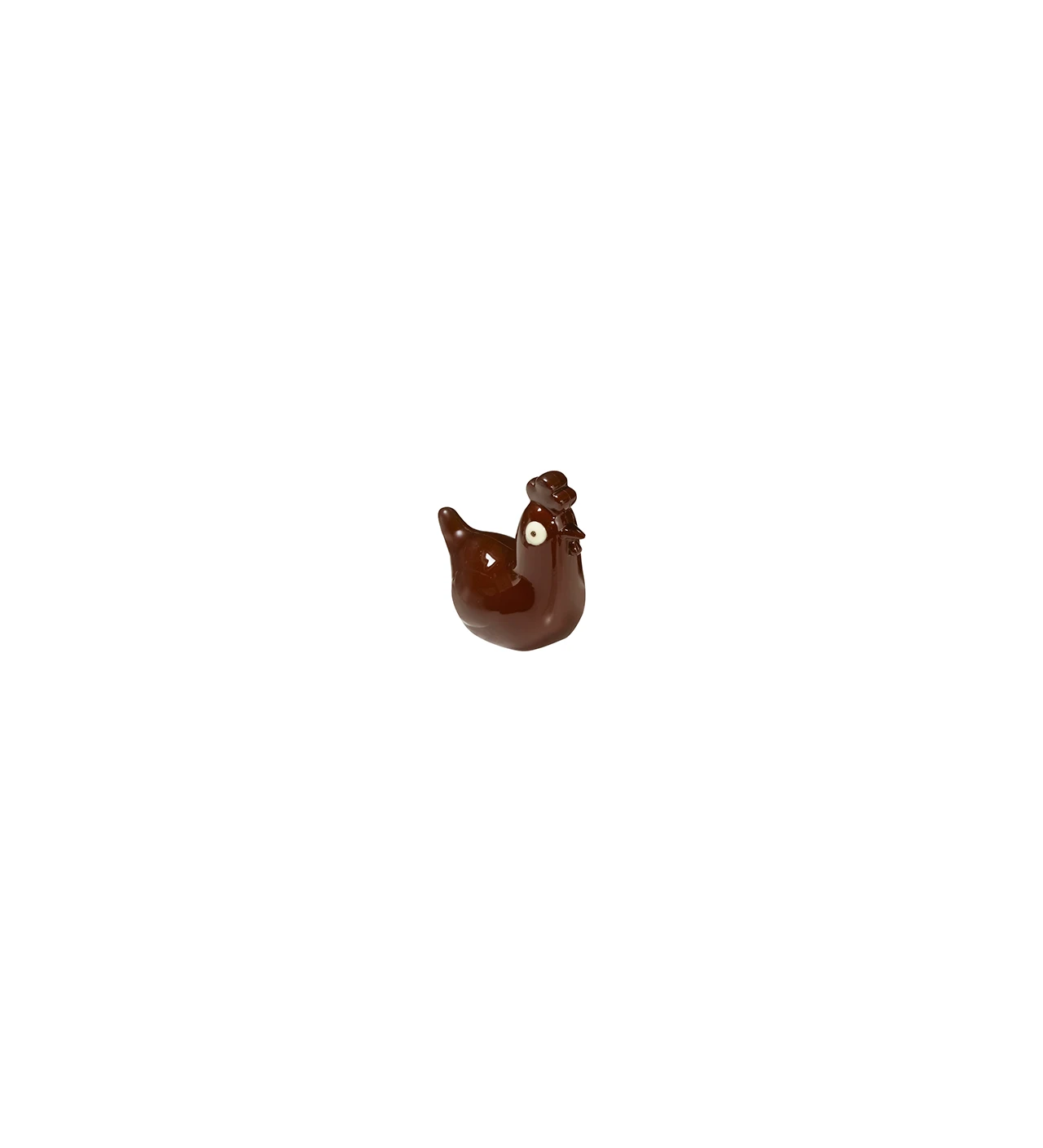 La pieza de chocolate pesará 65 g, o más si añades pequeños caramelos o figuras de Pascua antes de unir las dos mitades. Para conseguir una gallina con un plumaje sedoso y brillante, atempera el chocolate de cobertura y aplícalo con un pincel alimentario en las cavidades de este molde para chocolate. Deja que se solidifique en frío durante unos diez minutos y aplica nuevas pinceladas. Repite la operación las veces necesarias hasta obtener una cáscara lo suficientemente gruesa para conseguir una gallina brillante y crujiente.