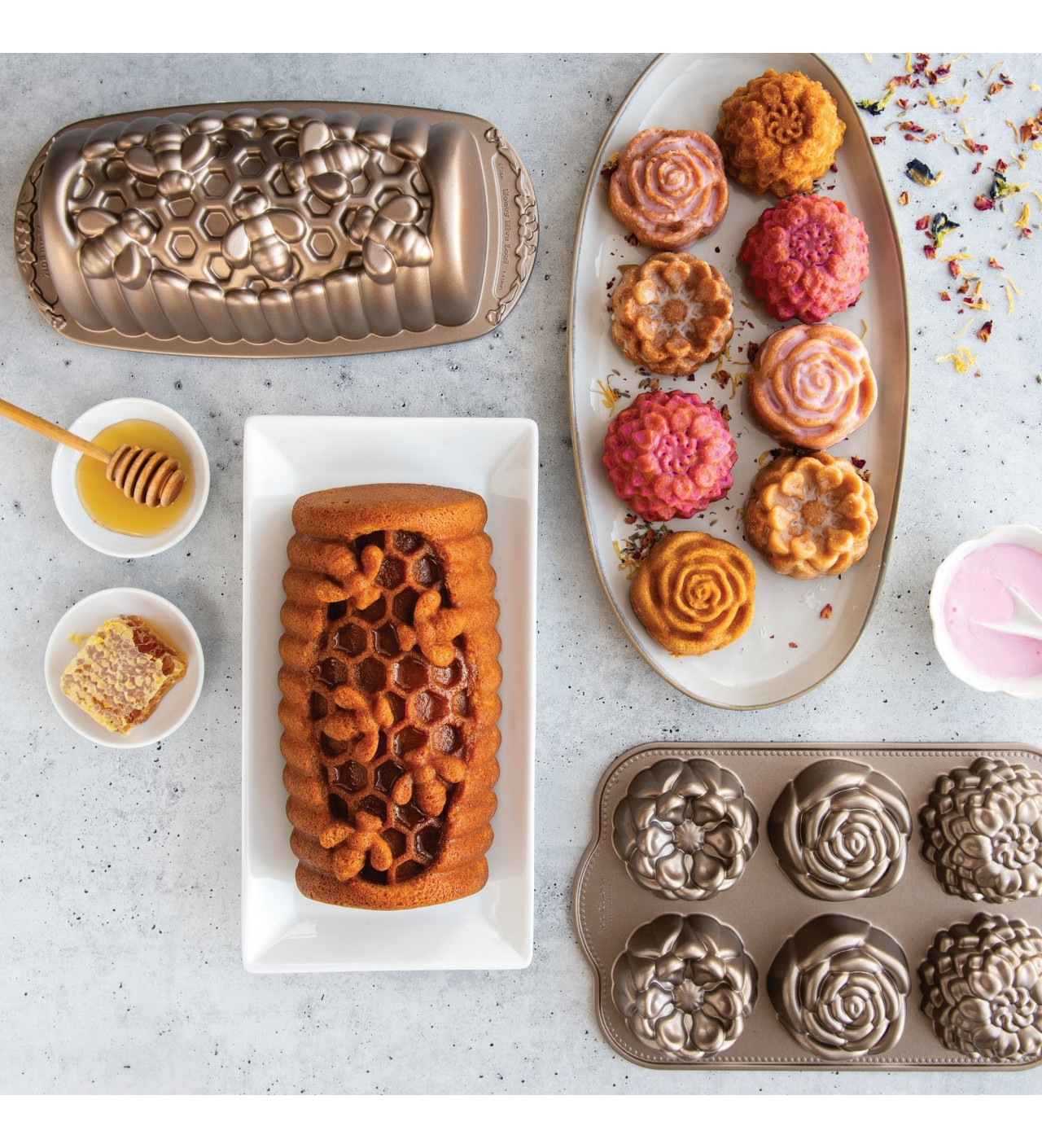 Demuestra tu amor por estos polinizadores que fabrican el delicioso néctar de la miel con un bizcocho delicioso hecho en el molde abejas Nordic Ware.