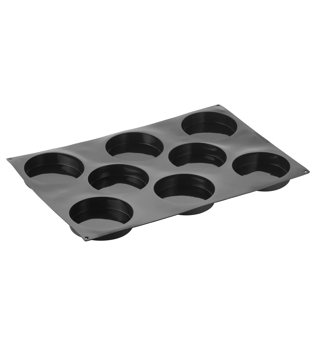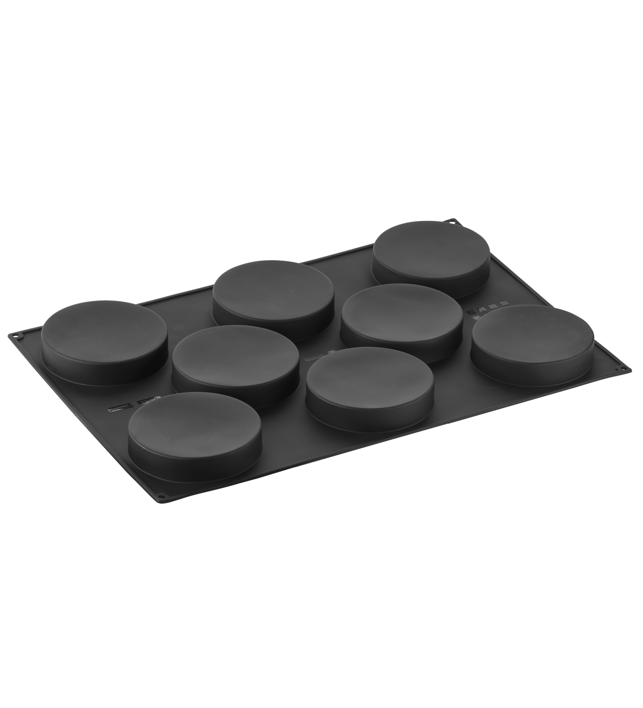 Diseñado para los profesionales, este molde de silicona mide 60 x 40 cm y tiene ocho cavidades. Con este molde de silicona podrás preparar rellenos redondos para tus postres. Prepara fácilmente ocho rellenos redondos en forma de disco de 14 cm x 3 cm de altura con una forma perfecta.