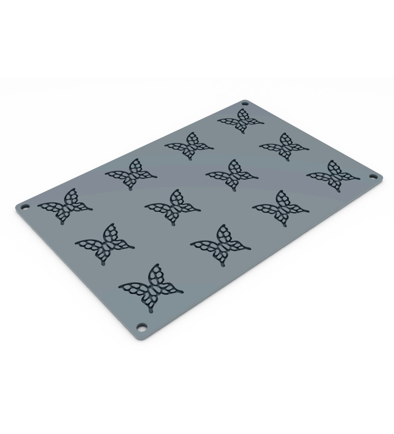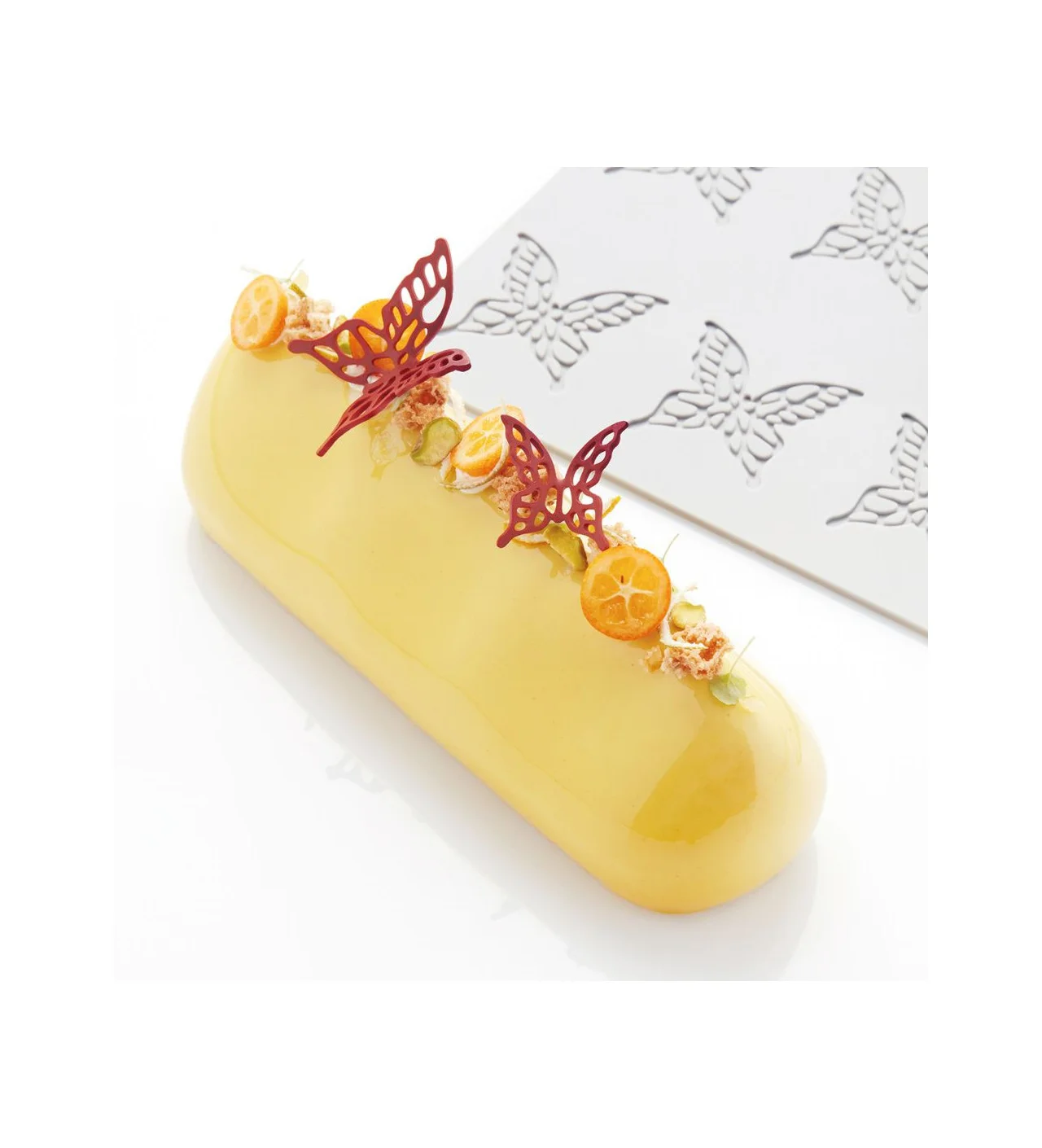 Consejo: Para obtener mariposas con efecto encorvado, te recomendamos colocar el molde de silicona sobre una superficie encorvada como lo desees, de este modo, las decoraciones tomarán la forma en la que estén posicionadas. También, puedes dejar que cuajen lo suficiente para que puedas manipularlas sin que se rompan y luego ponerlas en un acetato para tartas encorvado para que se termine de cuajar.