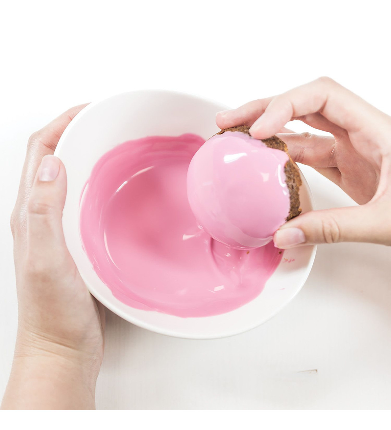Para obtener un glaseado espejo impecable, asegúrate que tu postre esté bien frio. Luego vierte el glaseado generosamente.