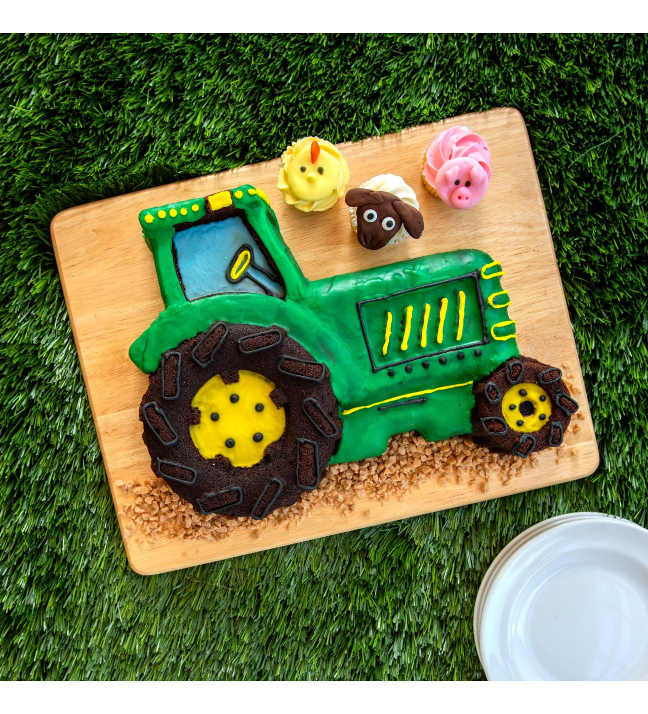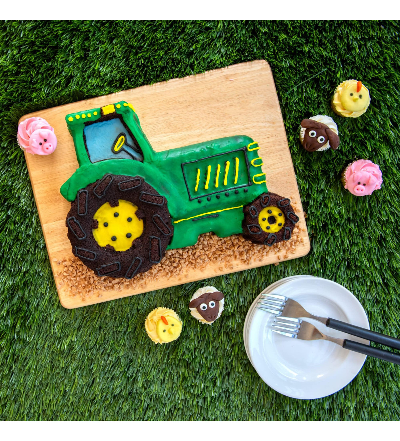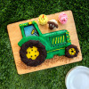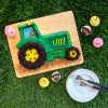 Ahora, solo te falta decorar tu postre como más te gusta. Un poco de glaseado de colores y algunas decoraciones de azúcar convertirán este increíble tractor en un bizcocho espectacular.